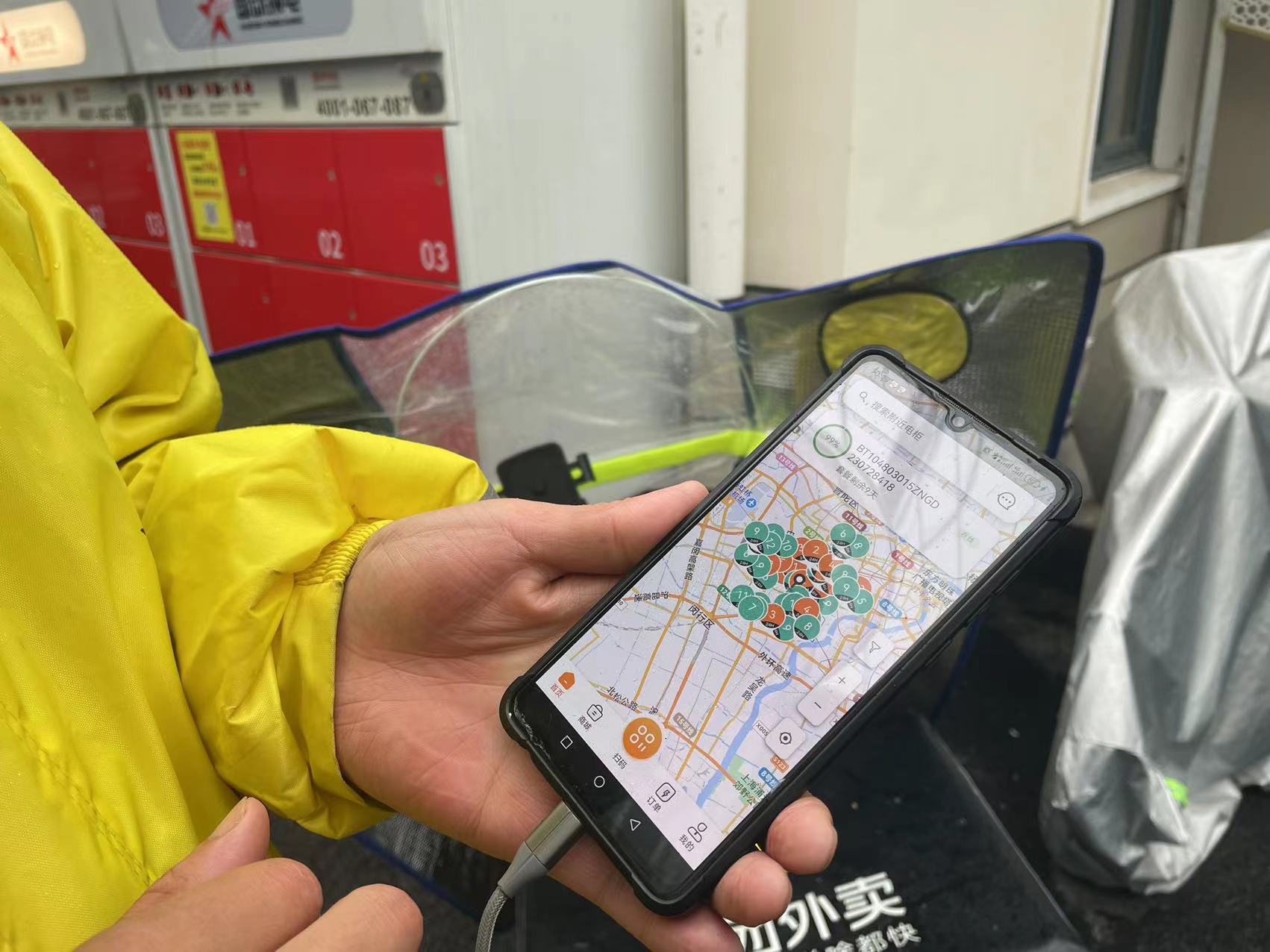 外卖小哥使用包月换电服务,手机端可查询附近换电柜。劳动报记者 包璐影 摄影