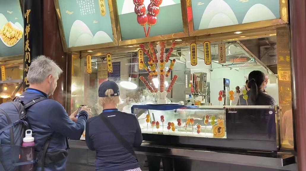 在豫园,香辣蟹、黑椒牛肉饼,糖葫芦串让来自德国的丹尼尔夫妇胃口大开。接下来,他们计划去外滩看夜景,赏浦江两岸的旖旎风光。