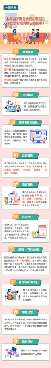 5月28日,记者从上海市民政部门获悉,近日,上海市民政局会同市场监管、公安、网信和通管等部门,联合发布了首个婚姻介绍服务机构合规指引,从婚介机构经营主体视角出发,覆盖全流程、聚焦关注点,鲜明告知婚介机构倡导什么、反对什么。其中,3-7天冷静期退费制度为业内首推,为提升整个行业的规范性、诚信度、专业化提供了参照依据和对标尺度。