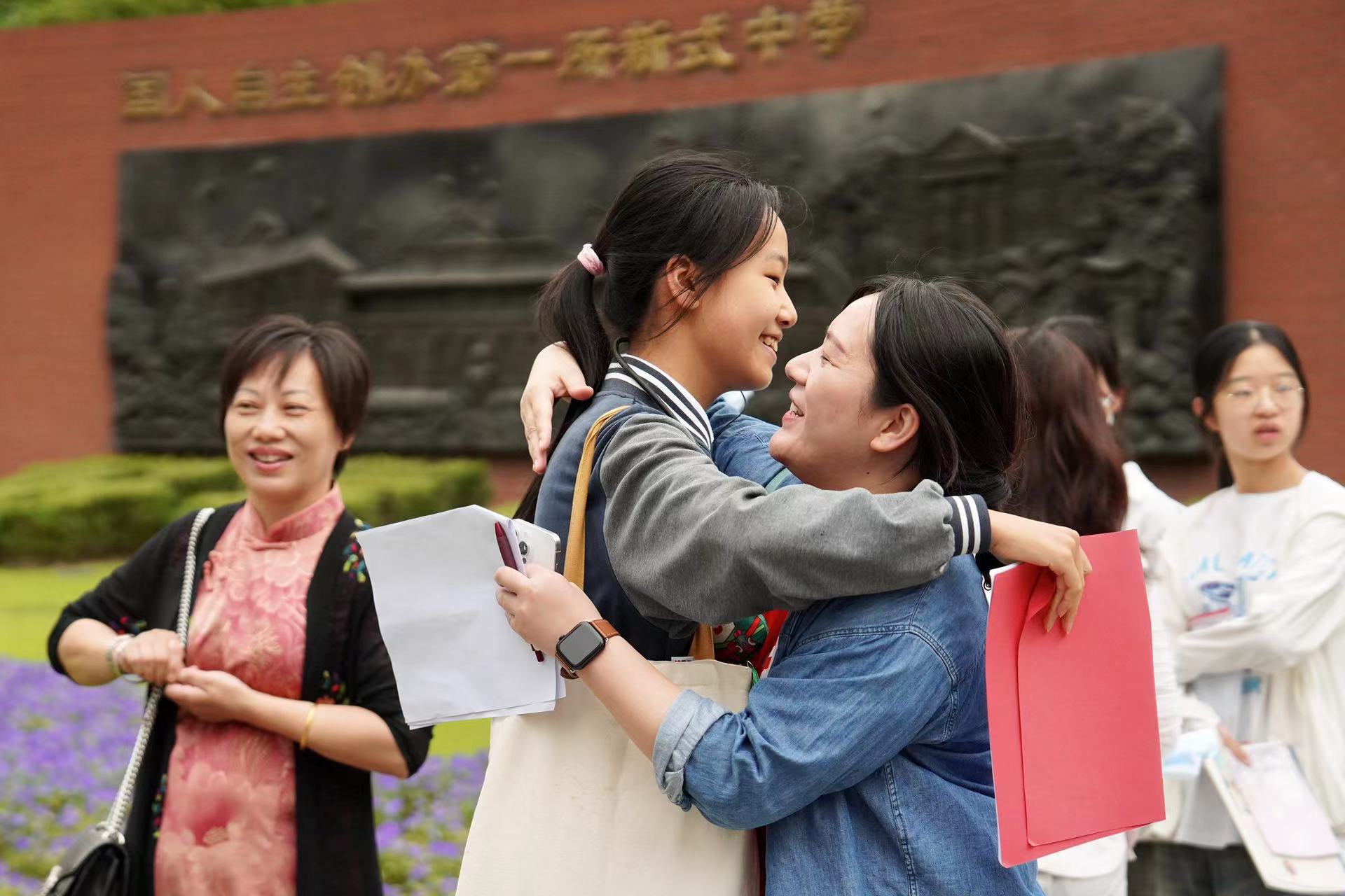 进考场前,老师给学生拥抱鼓劲加油。劳动报记者 贡俊祺 摄影