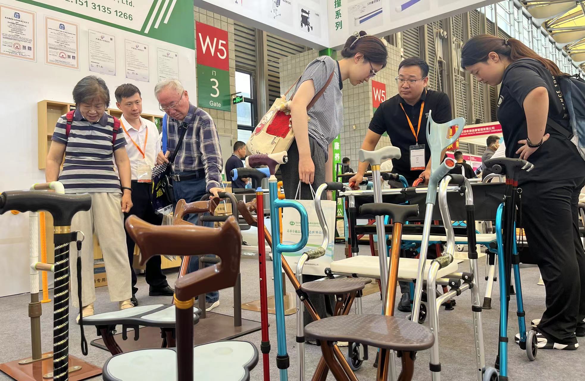 图为观众在看拐杖相关产品。劳动报记者贡俊祺 摄影
