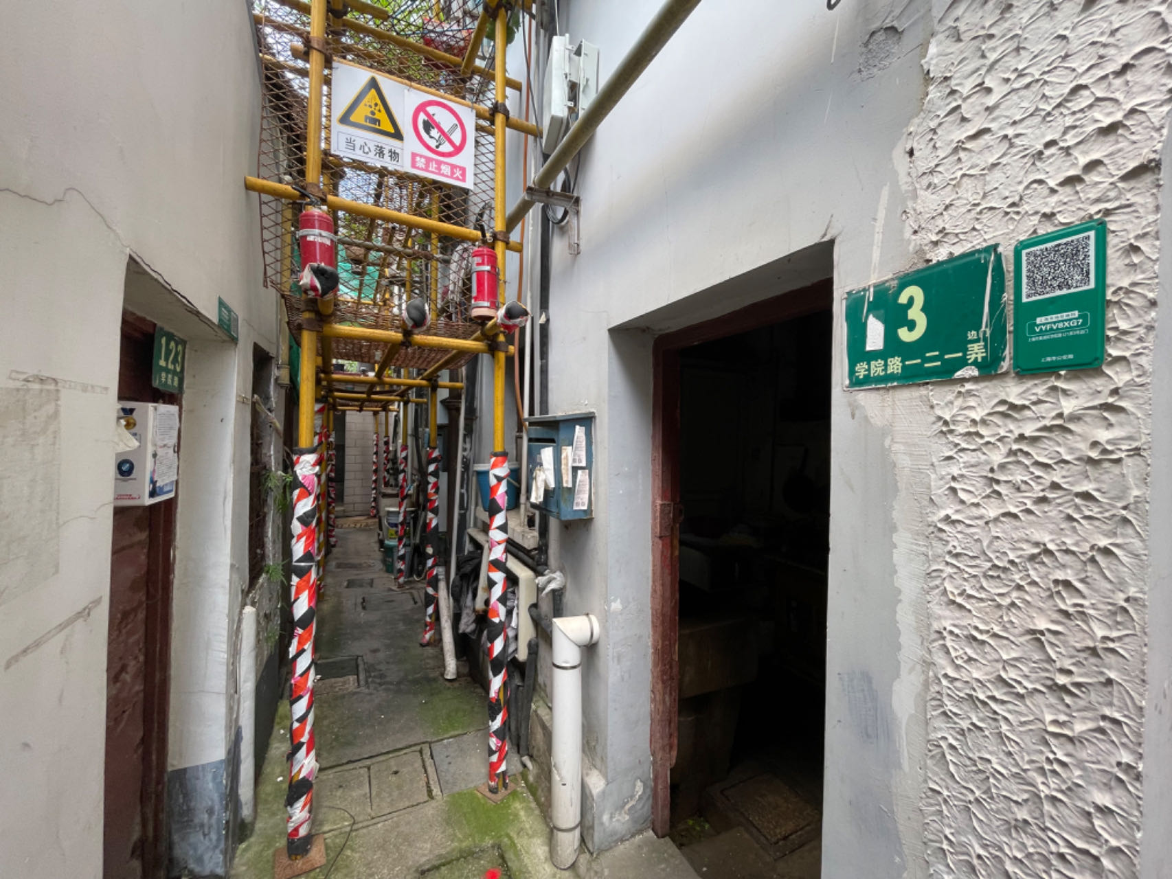 由于该老宅所处位置恰好位于两栋楼宇之间,外加脚手架凸出的占地面积,导致楼与楼之间原本就不宽敞的过道变得更为局促。记者反复通行了几次后发现,穿梭在脚手架下有一种较为明显的压抑感,而且单次也只能允许一人通过。