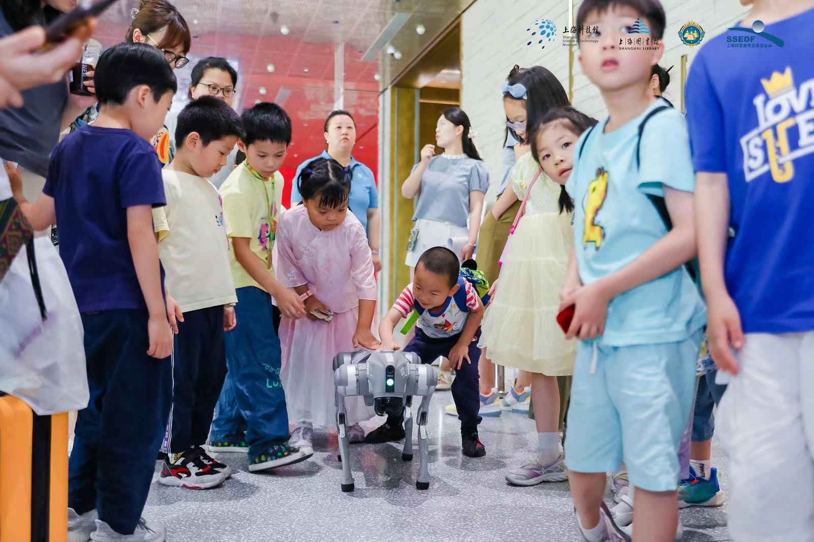 头图为小朋友们在看机械狗。科技馆供图