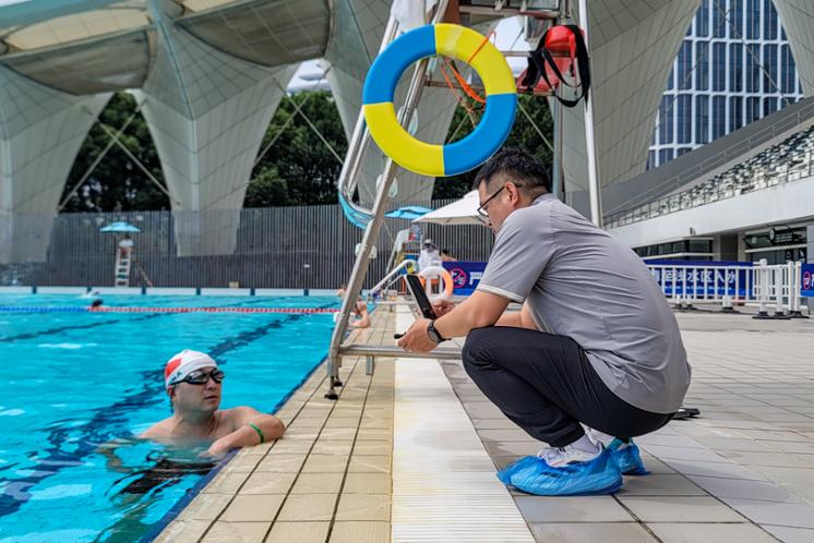 劳动报记者王卫朋(右)高温天探访东方体育中心室外泳池。劳动报记者 颜筱依 摄影