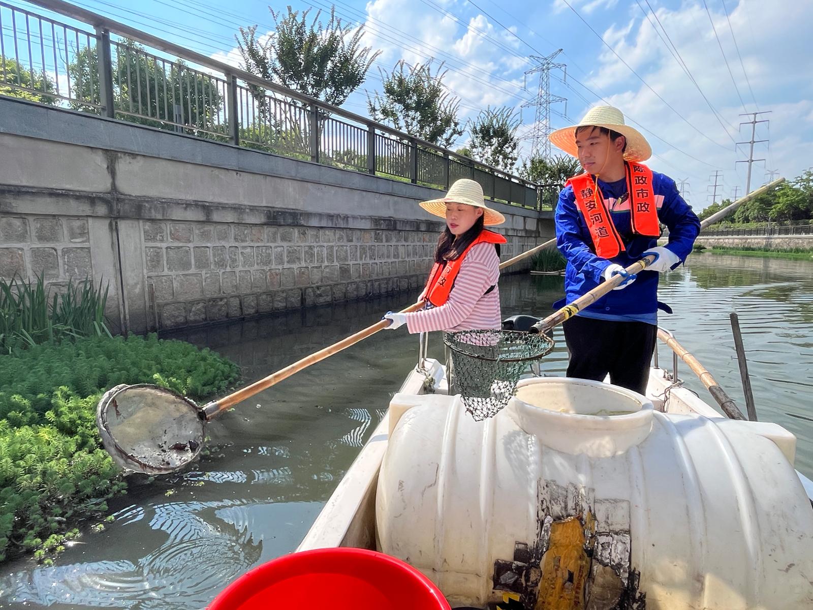 劳动报记者包璐影(左)跟随静安区河道水政管理所的养护人员一起打捞福寿螺。劳动报记者 贡俊祺 摄影