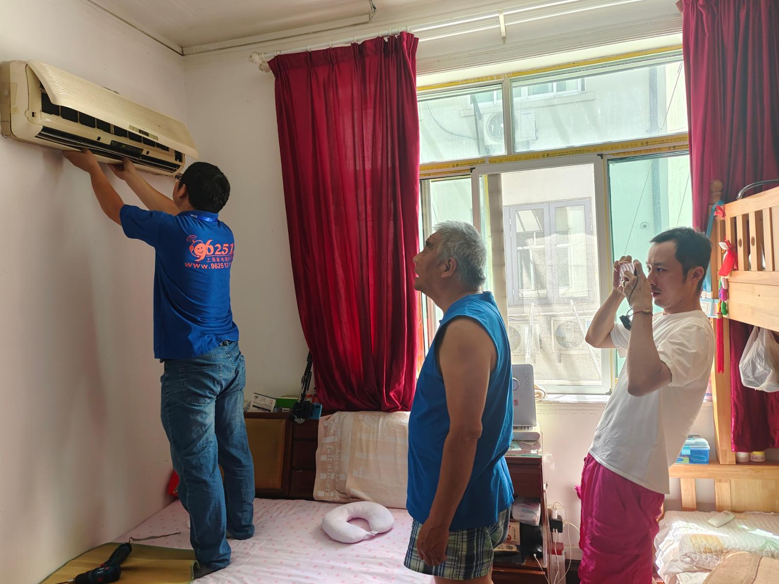 劳动报记者贡俊祺(右)拍摄空调维修现场。劳动报记者 陆燕婷 摄影