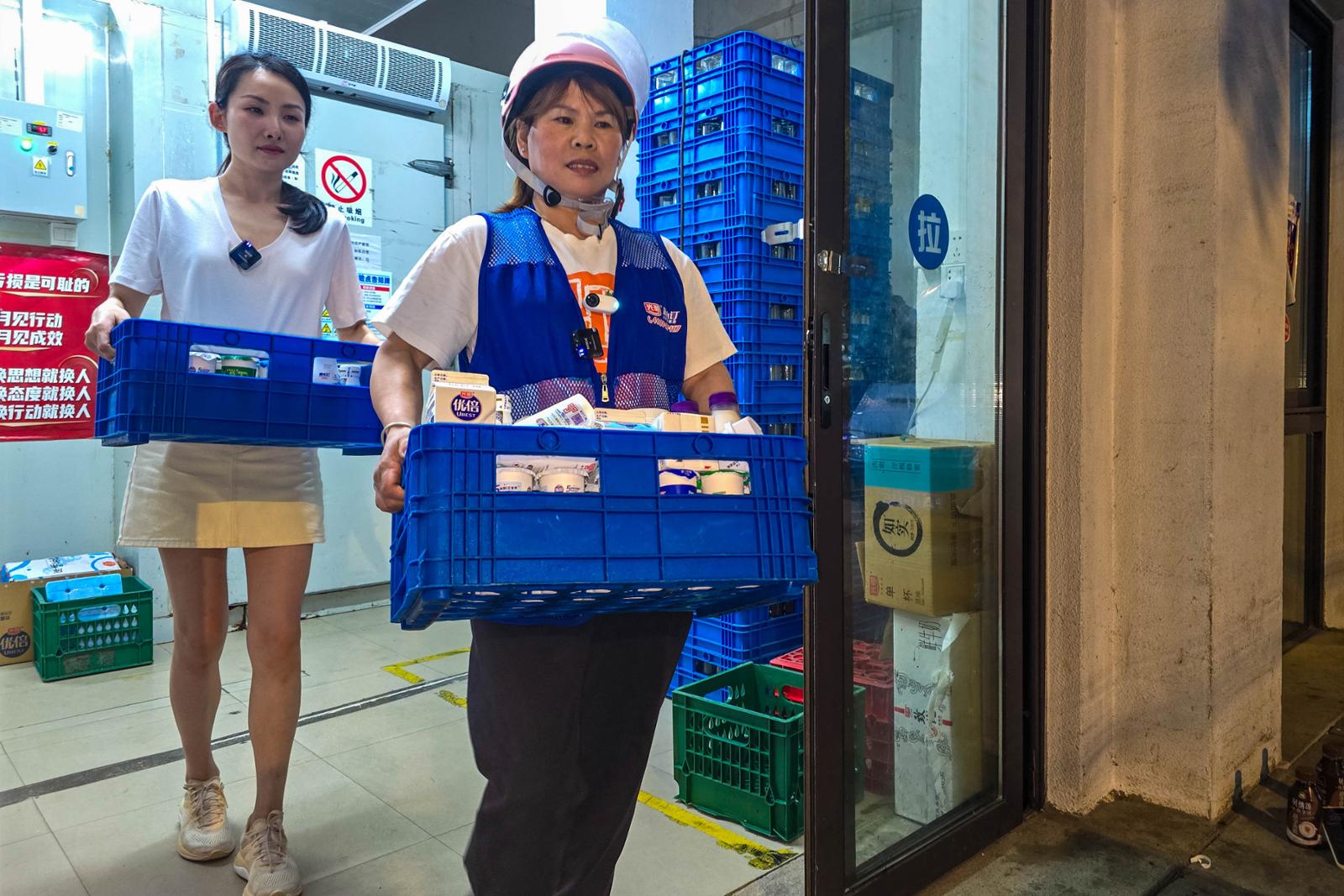 凌晨两点,劳动报记者叶赟(左)与光明送奶工一起去送牛奶。劳动报记者 颜筱依 摄影
