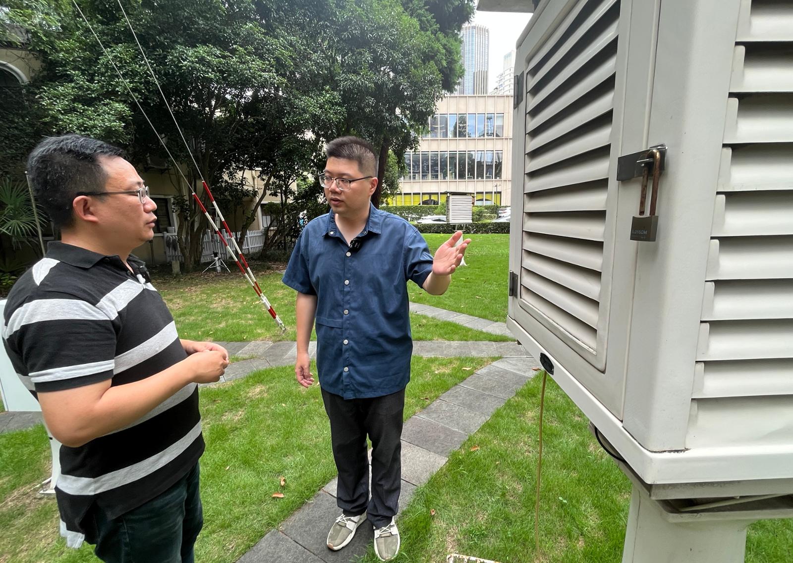 劳动报记者罗菁(左)走访气象台测温现场。劳动报记者 贡俊祺 摄影