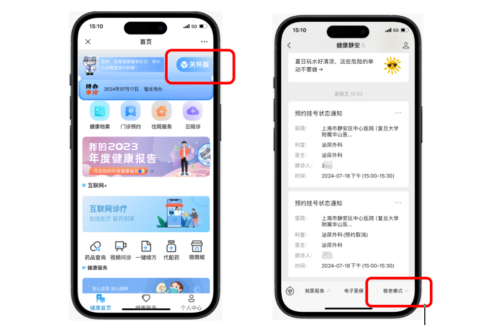 截至2024年7月15日,“健康静安”微信公众号信息无障碍升级改造1.0版本正式上线。一是优化快捷入口,在公众号首页菜单、就医服务首页右上角增加显著的“关怀版”快速切换入口,进入无障碍模式,同时保留原有右下角“敬老模式”入口,方便老年用户操作。二是优化操作方式,“关怀版”和“敬老模式”界面只保留老年人常使用的几项功能。三是视觉优化,统一字体样式、加强视觉呈现、完善控件显示。四是听觉优化,增加长文本语音播放功能。五是在线客服引导,提供24小时在线智能客服,解决用户常见问题等。
