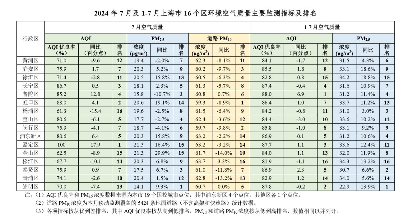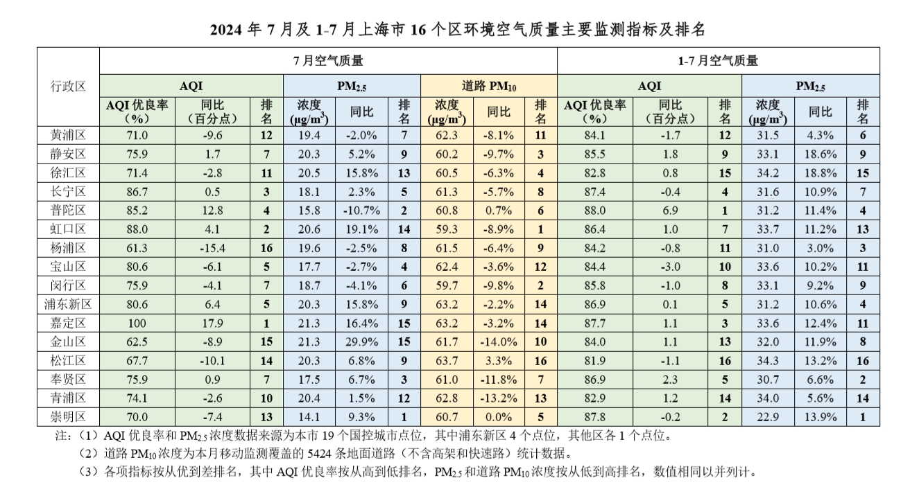 近日,上海市生态环境局发布了7月及1-7月上海市环境空气质量状况。