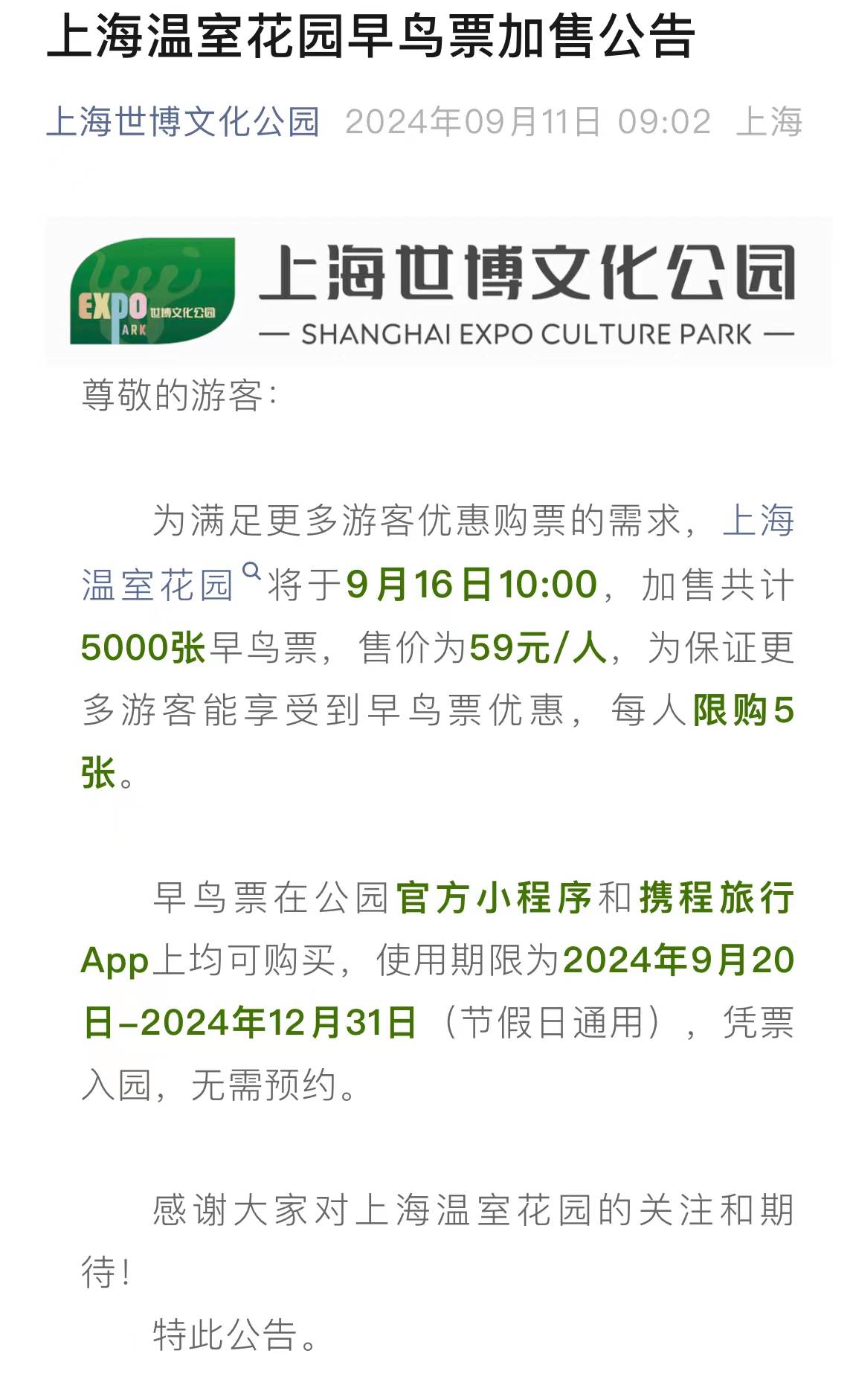 9月11日,上海世博文化公园发布公告,将于9月16日上午10:00,加售5000张上海温室花园早鸟票。加售早鸟票仍为59元/人,售票渠道为官方小程序和携程旅行App,每人限购5张,可以在9月20日-12月31日期间使用,节假日通用。