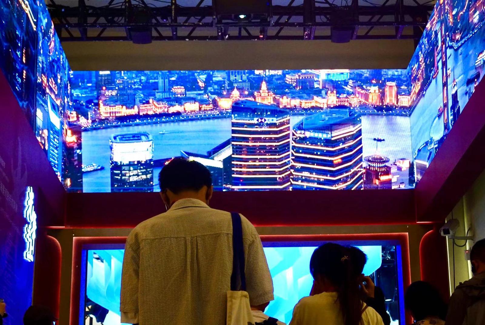 走进“光年之行”展厅,犹如踏上一艘乘风破浪的游轮。船舷南侧,既有从外滩“万国群”到陆家嘴“三件套”的浦江建筑夜景对话,也有“光影秀带”重现了外滩视角的浦江灯光秀。船舷北侧,蜿蜒的苏州河从疏浚治理到景观照明,在蝶变中点亮人民城市的滨河夜生活。值得一提的是,“AI电音”在《摇啊摇摇到外婆桥》的童谣混效中,借助AI声光电系统和虚拟人荡舟苏河的飞越视角,创构了河滨电音节的生活娱乐场景。“夜色步道”通过光影切换在微缩版滨河步道上,还原42公里苏河两岸绿化、栈点等光影融合的惬意夜生活。