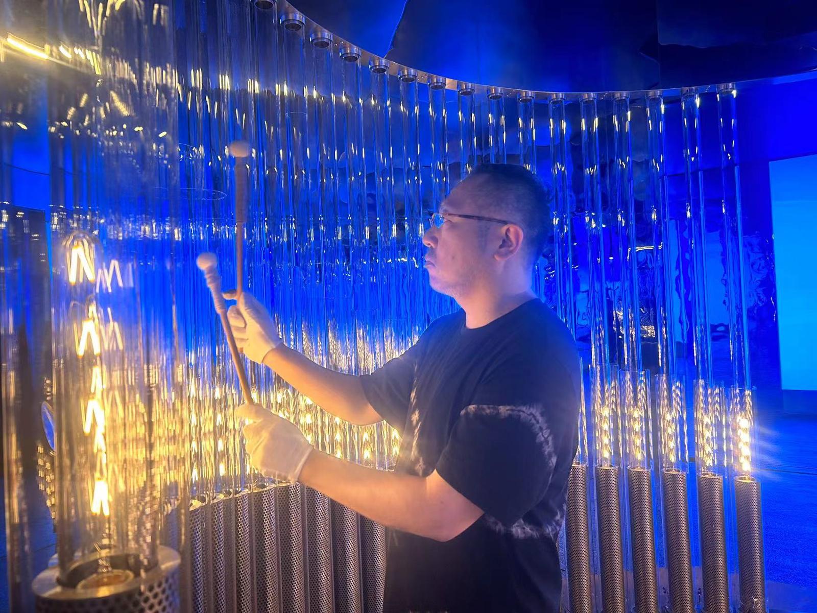 据饭岛钢宗介绍,该装置由排列成圆形的、长度各异的50根玻璃管组合而成,是演奏者及演奏的音乐空间与周边环境及风景融为一体的“透明的打击乐器”,结合观展者参与敲击的行为,共同孕育出如同生命般的“光”。