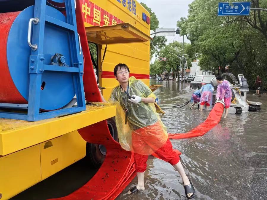 区水务局已有的2台“龙吸水”大功率防汛排水泵车,已在积水程度相对严重的新四平公路海平路进行排水工作。此外,向外区调的10辆“龙吸水”大功率防汛排水泵车也正在赶来,到位后将第一时间前往相关地区进行排水作业。
