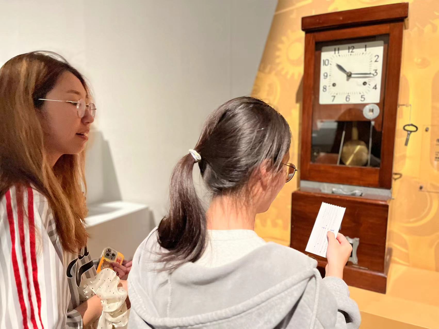 在展览现场,一款1950年英国的纸卡考勤钟吸引了不少参观者的目光,纷纷上前体验。据了解,考勒钟,也称打卡钟,是一种企业进行员工考勤管理的计时打装置。记者将厚纸卡也就是时间卡插入时钟的插槽申,拉动手柄,机器就会在卡上打耶时间信息(时间戳)。据介绍,计时员会通过卡上的时间戳来检查员工的工作时间,并根据相应的规章制度计算员工的工资。