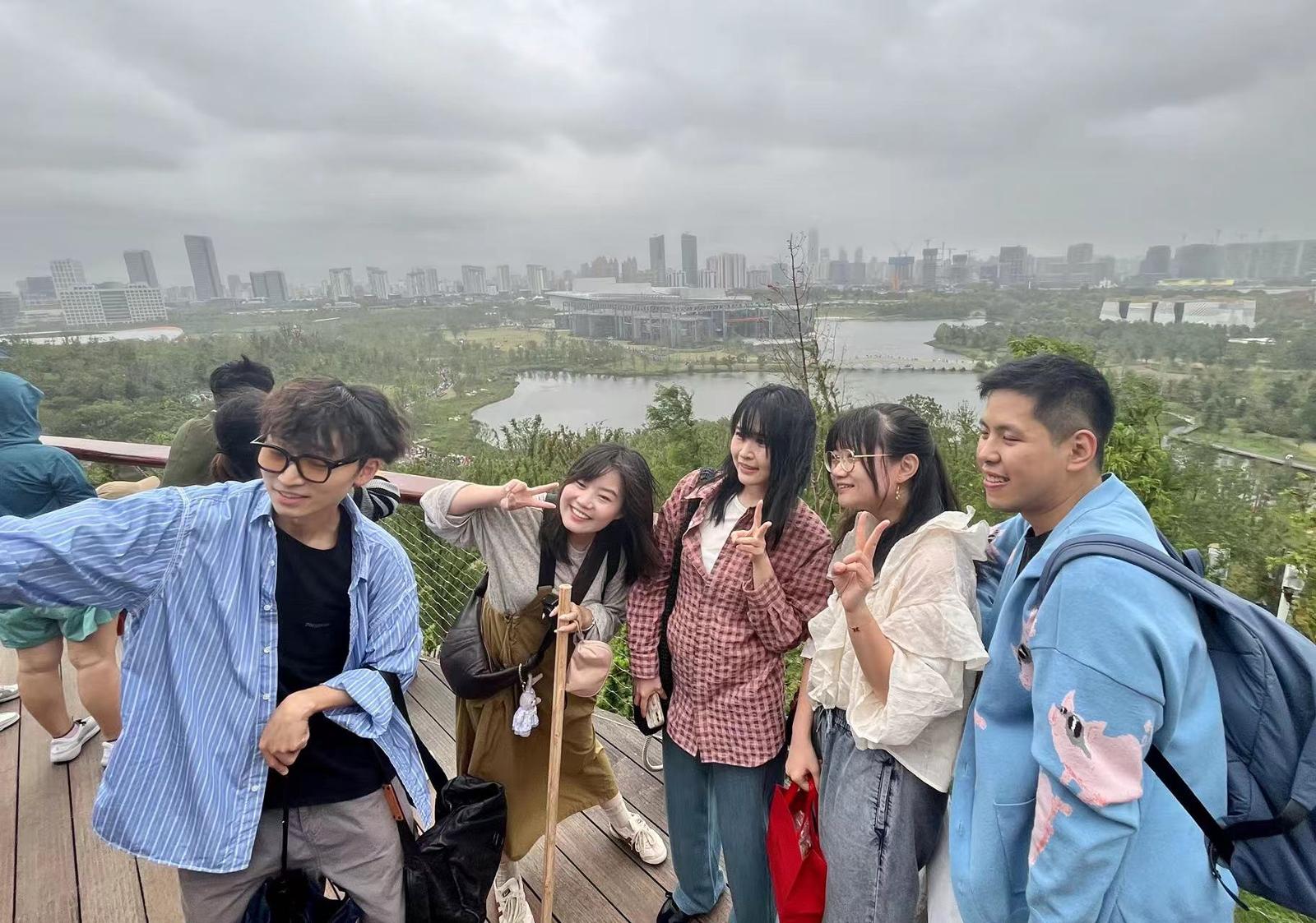 记者在现场看到,登顶后的市民游客都纷纷拿出手机、相机,找到自己心仪的机位拍下照片。由于双子山不高,对于老人、孩子而言爬起来也不算困难,因此很多市民都是携一家老小一起前来,并在观景平台留影打卡。