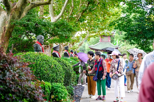 行走过程中,大家或在这些生命纪念地标前驻足沉思,感悟生命的伟大与崇高;或向英烈和大爱者鞠躬献花,表达诚挚的缅怀和敬意;或在打卡点的展板前细细品读,了解背后的历史与文化;或纷纷拿出手机,拍照记录园区宜人的秋景,将自然元素与生命文化共同定格。