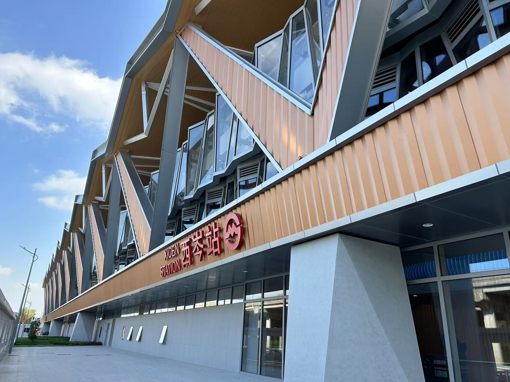 记者在现场看到,车站结合江南水乡整体风貌进行双站(示范区线西岑站)融合设计,通过错落有致、交汇融合的建筑造型设计,以立面V型钢柱桁架系统与屋面折叠桁架系统搭配,实现了建筑结构和空间的一体化,生动展现江南水乡的美丽风韵;西岑站屋面造型为一把徐徐展开的折扇,象征着海纳百川、包容共济的上海城市精神;外立面折扇形的玻璃幕墙与银灰色的钢骨互相辉映,呈现光影幻化、晶莹剔透的效果。