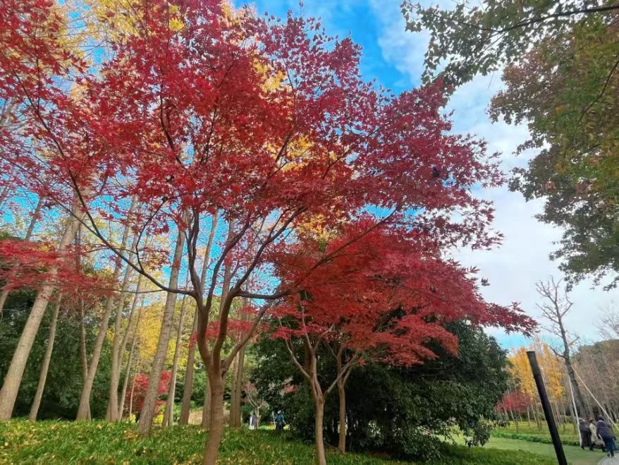 此外,园内的水杉、红枫也开始展现属于自己的风采。大红、深棕、浓绿层层晕染,每一棵树各有夺目之采。在灿烂的阳光下,随风摇摆款款动人,静谧而安静,显得绯红而温暖。