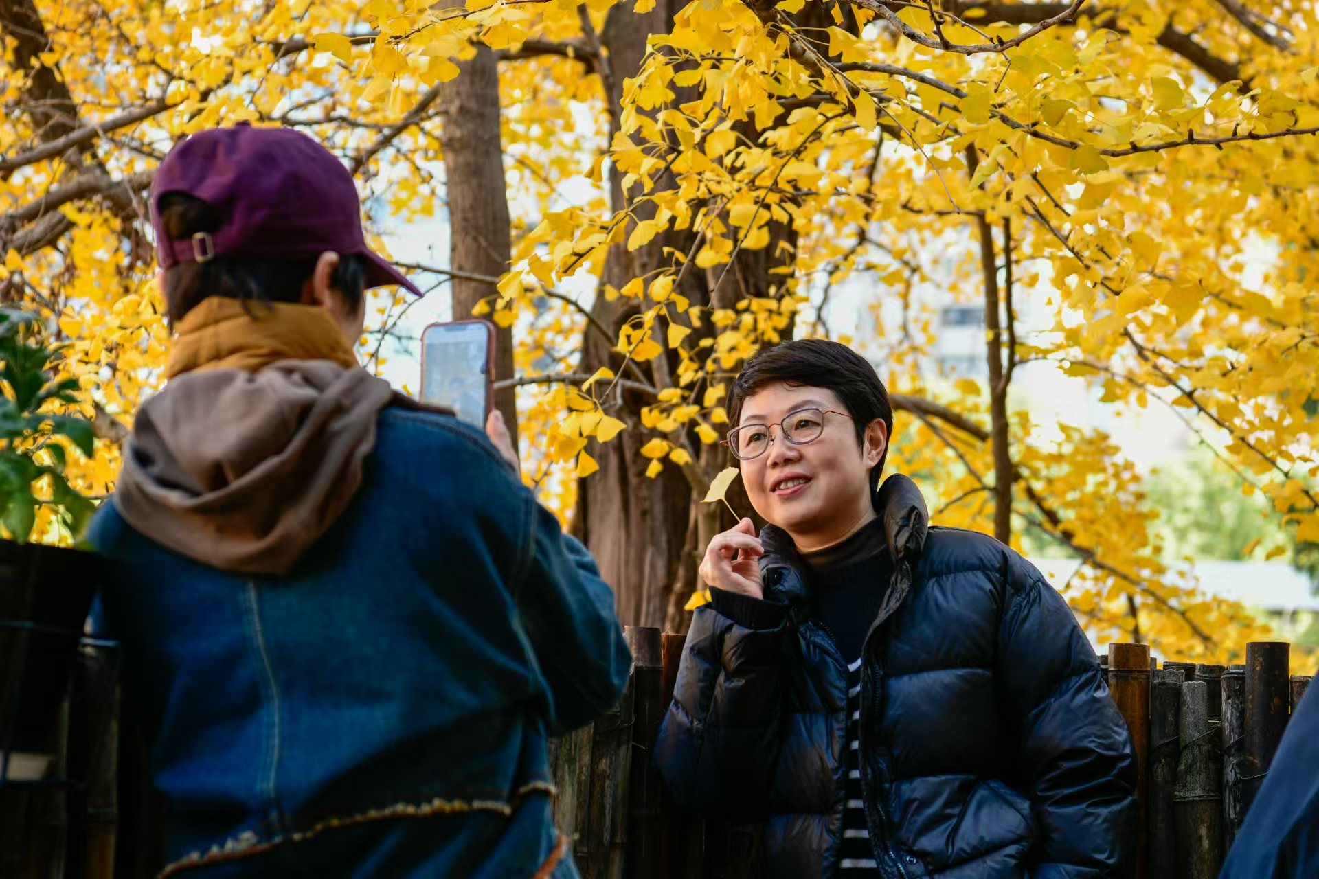 头图为市民与银杏庭院留影并“比心”。劳动报记者 颜筱依 摄影