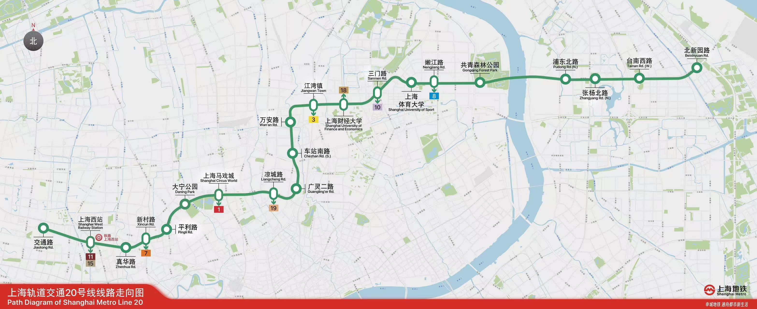 上海市轨道交通20号线一期东段及东延伸工程线路将途经静安区、虹口区、杨浦区、浦东新区,主要沿广中路—广灵一路—水电路—场中路—政立路—嫩江路—洲海路走行。线路全长约21公里,均采用地下敷设方式,设14座车站,平均站间距约1.5公里。其中包含换乘站5座,分别为凉城路站(与19号线换乘)、江湾镇站(与3号线换乘)、上海财经大学站(与18号线换乘)、三门路站(与10号线换乘)、嫩江路站(与8号线换乘)。