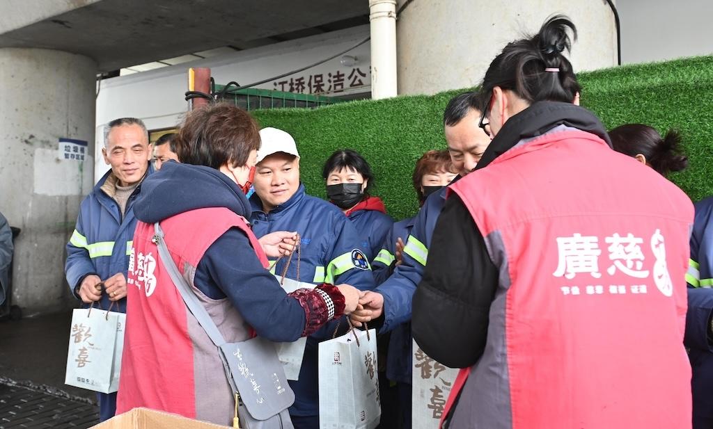 为了让更多保障市政服务留沪过年的工作人员感受到社会温暖,当天中午,刚刚制作好的桂花糕和八宝饭被送往江桥保洁公司道班房,为新春期间坚守岗位的环卫工人送上祝福。