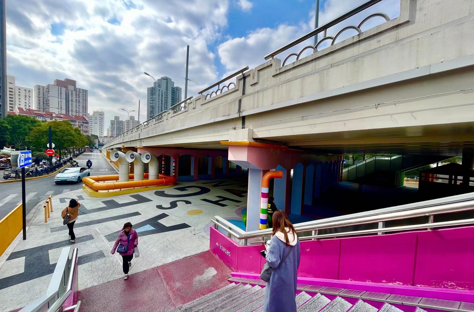 位于江苏北路万航渡路的“苏河超级管”桥下空间是新晋的“网红”地标,不少市民都慕名前来“打卡”。不用特别走进这个空间,只在远远的地方眺望,就能被这里的“多巴胺”配色深深吸引。