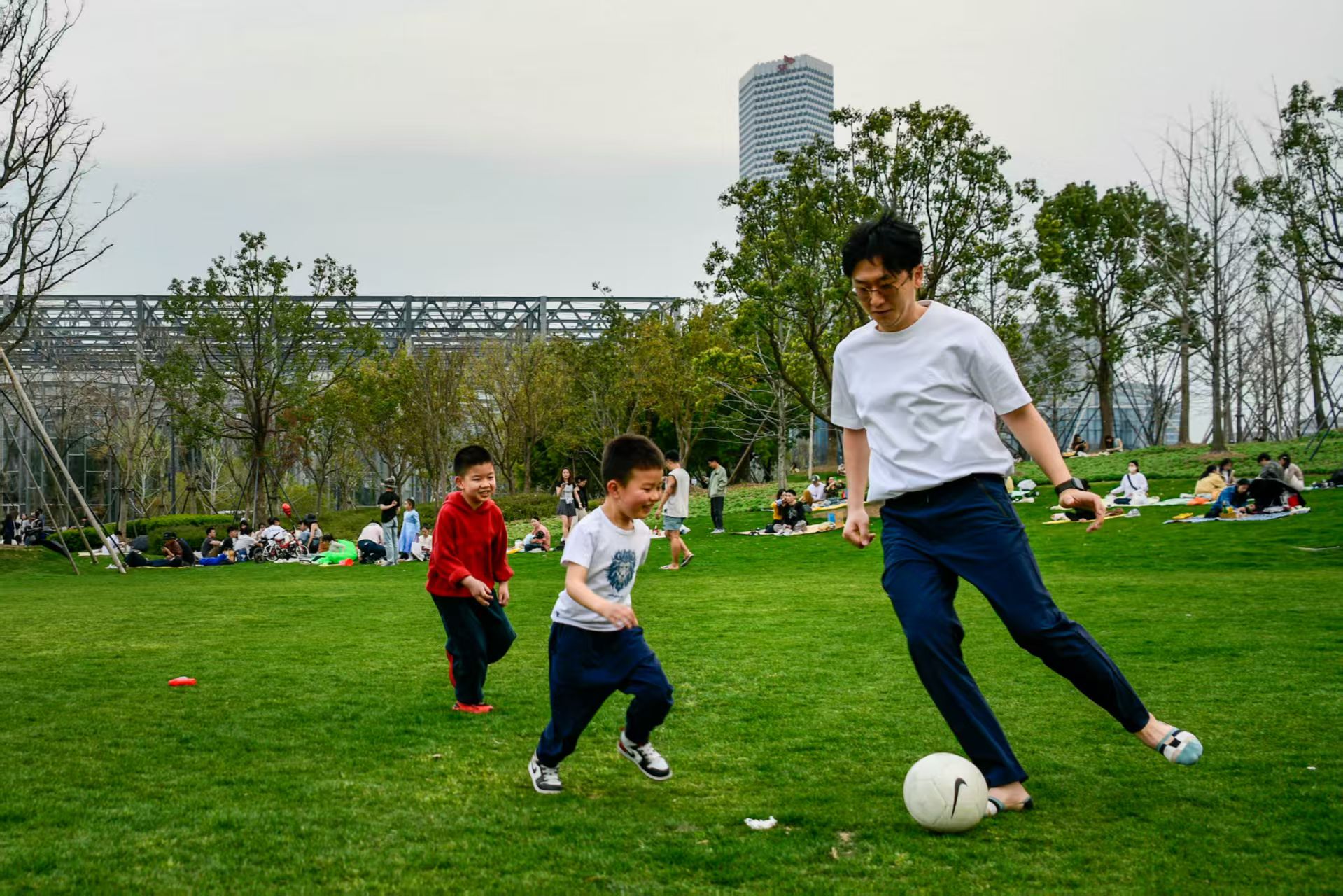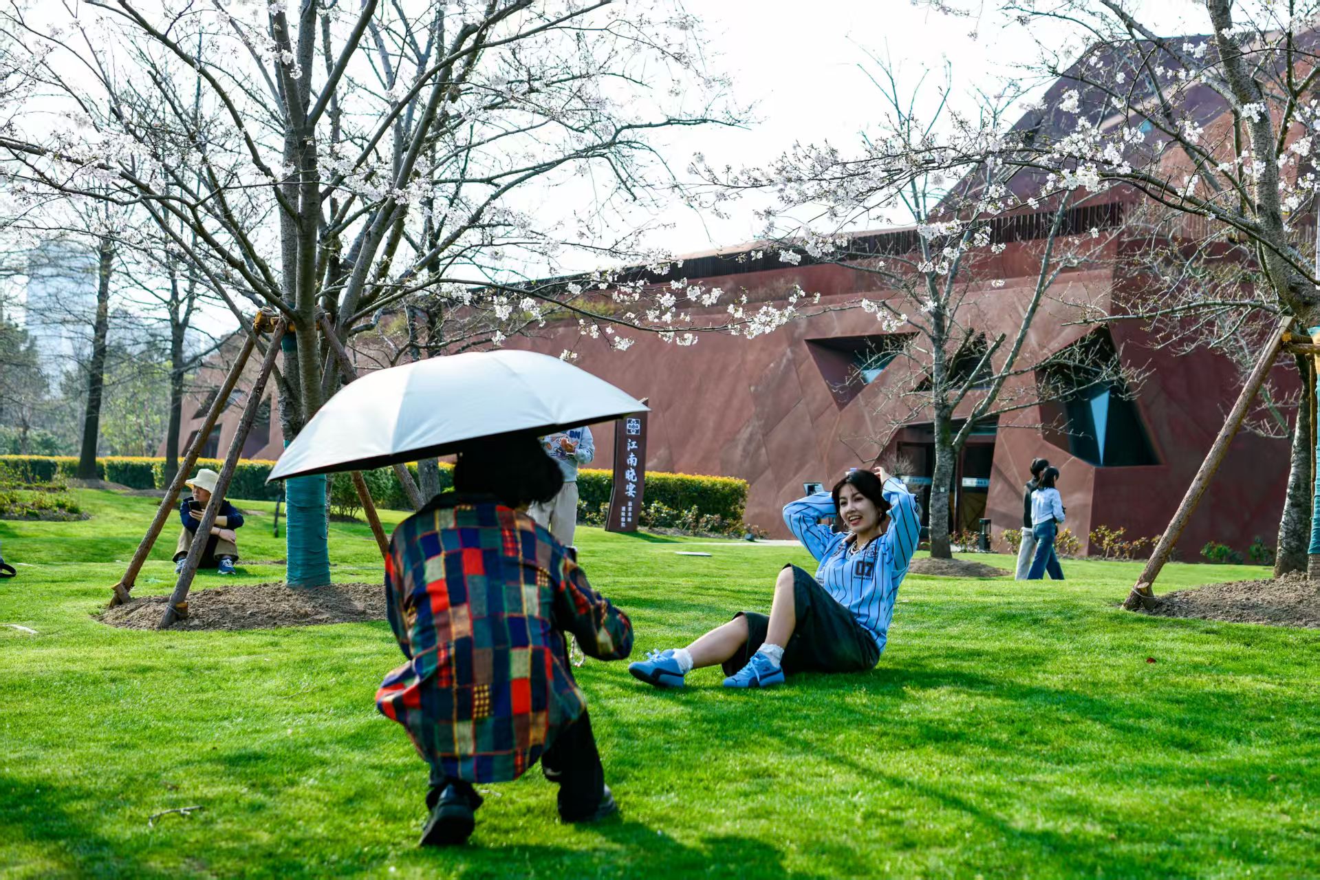 大草坪成为大伙“孵太阳”的好去处。劳动报记者 颜筱依 摄影