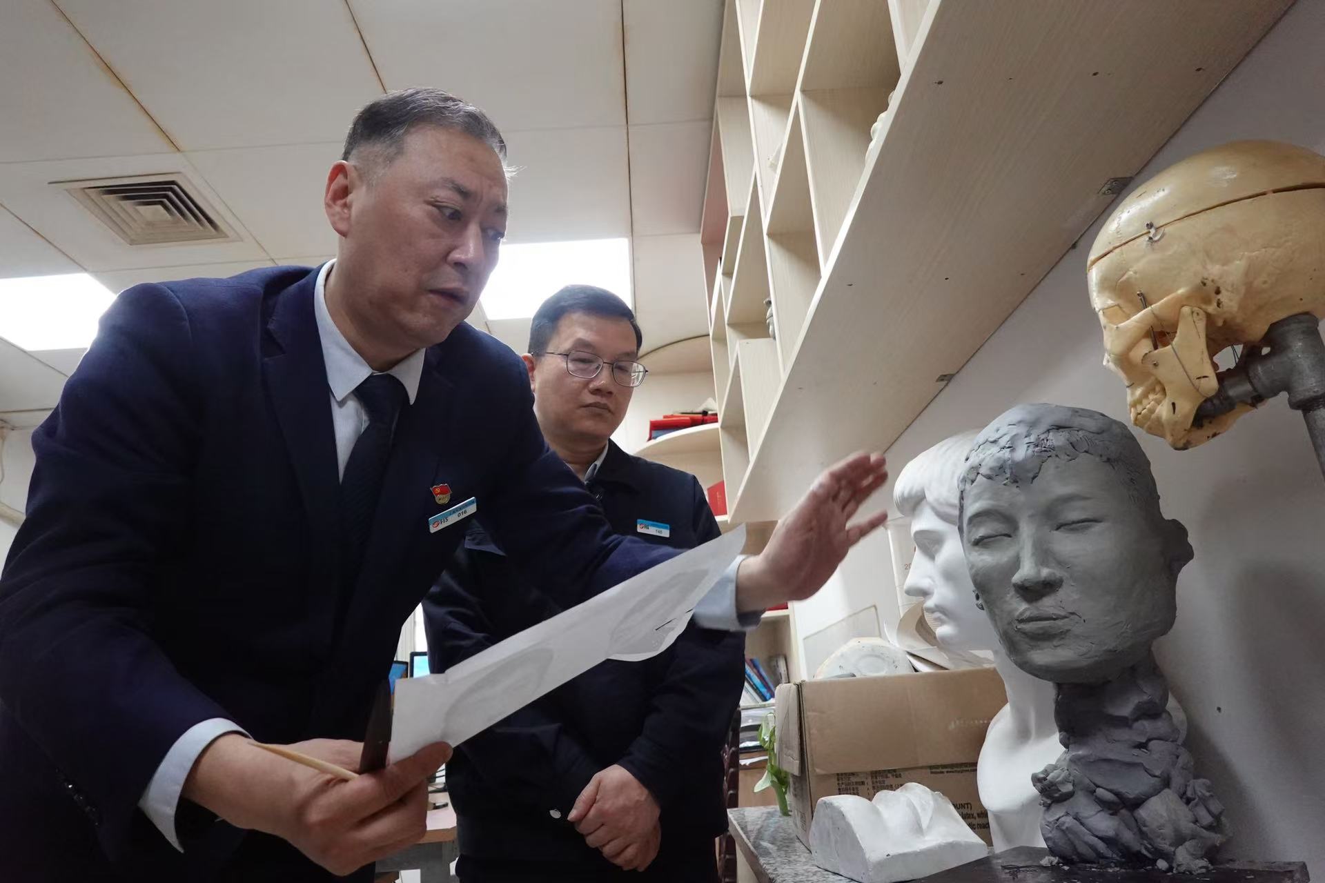 徐军在与徒弟讲解面部雕塑。劳动报记者贡俊祺 摄影