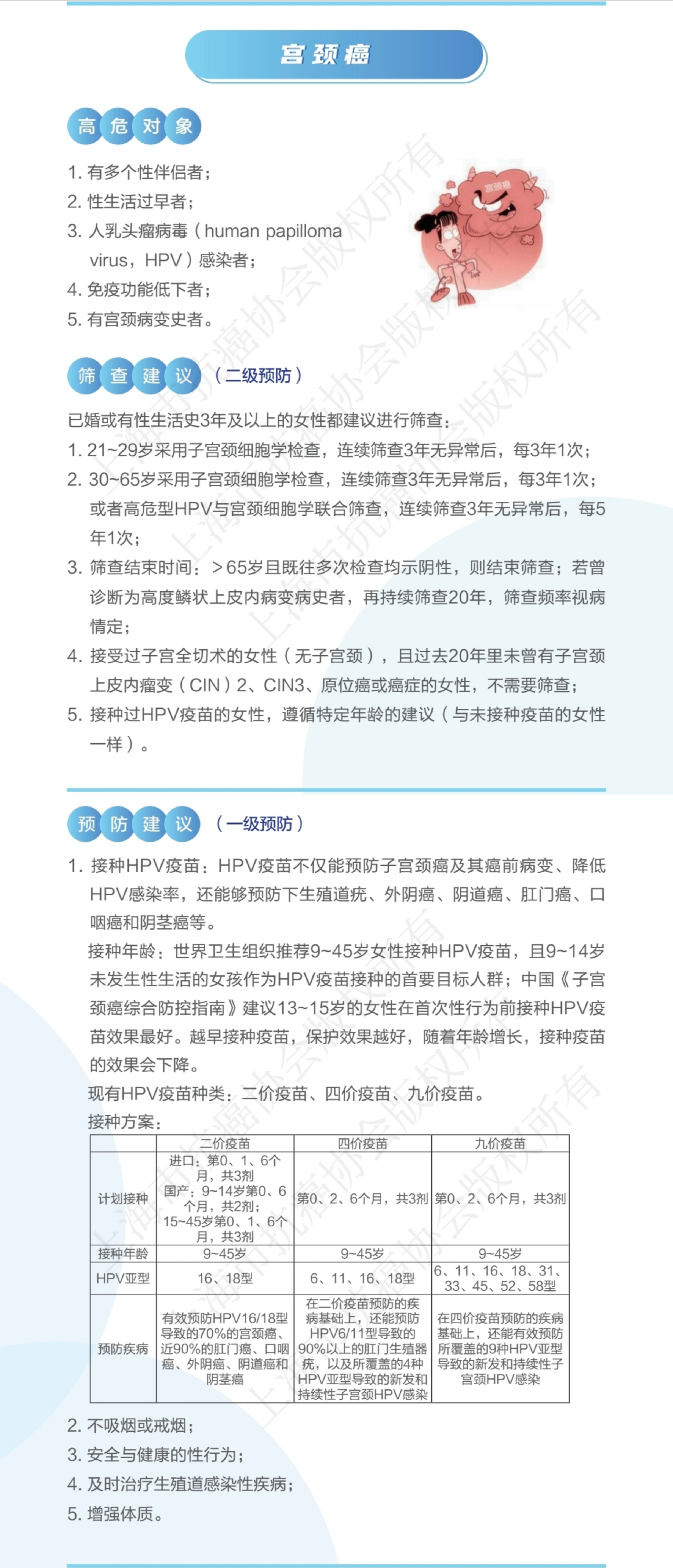 2025版“推荐”共涉及24个瘤种,涵盖目前全国人口94%、上海市居民95%以上的恶性肿瘤新发病例; “推荐”中还包含儿童肿瘤、遗传性癌症和疫苗可预防癌症等三个癌症专题,提供了七个降低常见癌症风险的专业建议,以及一张分性别和年龄段的癌症筛查推荐时间表,为公众提供了全面、科学的防癌指导。