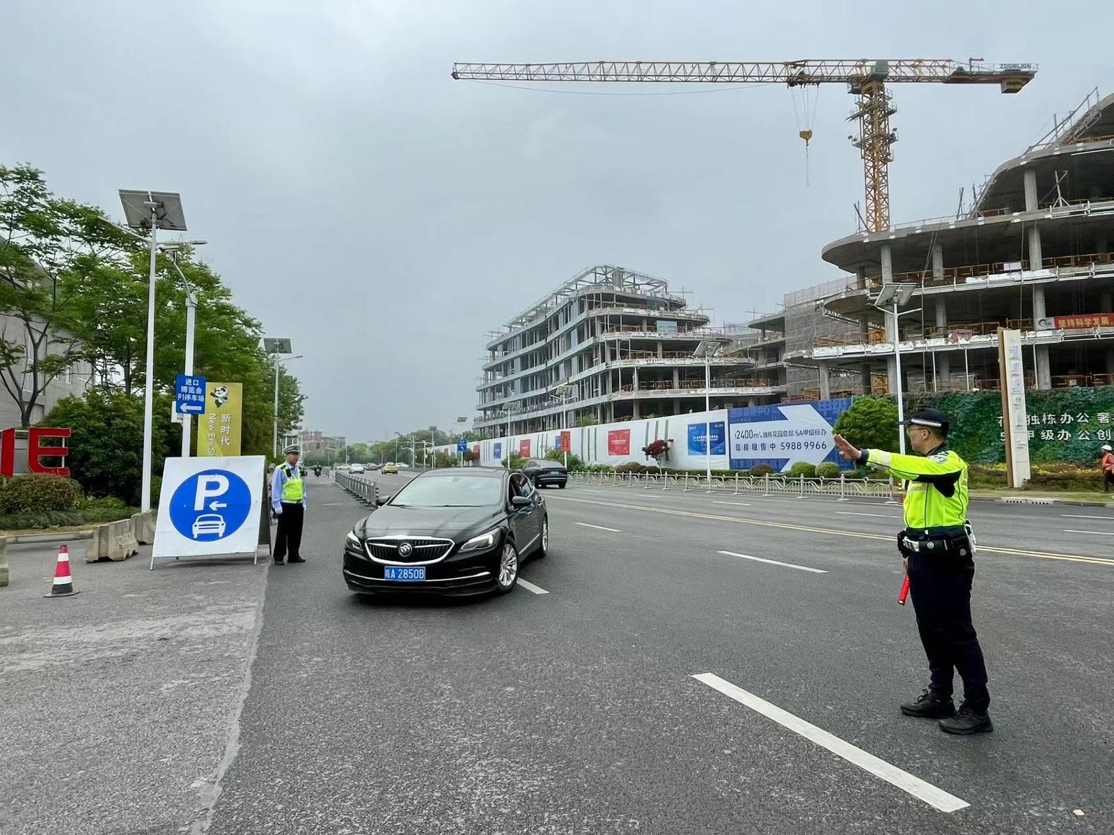 青浦交警正在停车场外围进行车流引导。劳动报记者 包璐影 摄影