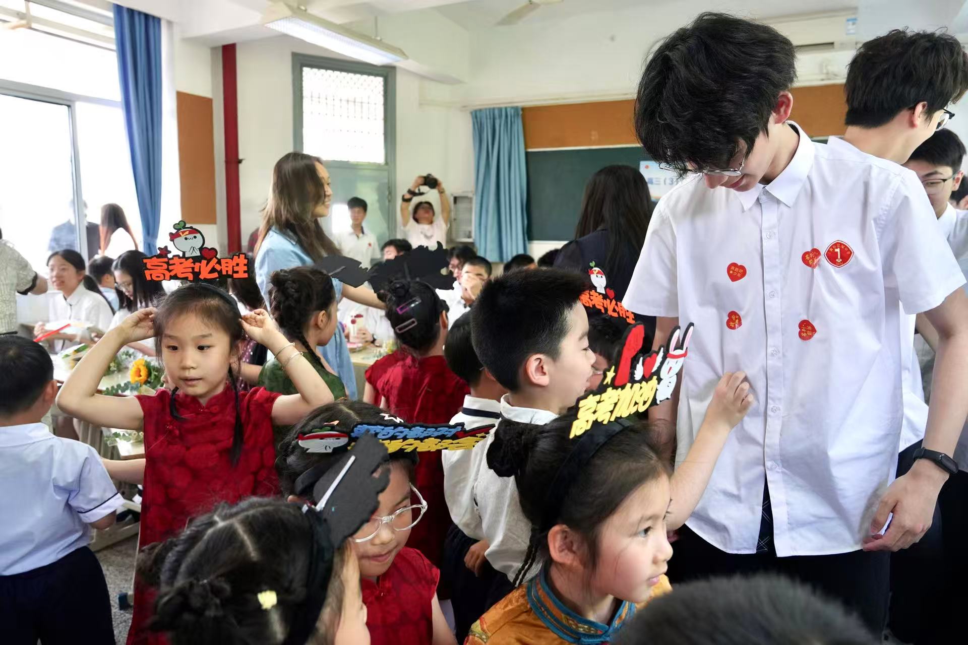 美好又温暖,是整场欢送会的主题。“高考,就是高高兴兴考试,你们不用紧张哦!我们把得到的小红花都送给你们!”宝山区机关幼儿园的小朋友们走进高三年级教室,为哥哥姐姐们送上祝福。头顶“高考加油”发箍的小朋友们把写满祝福的爱心贴纸贴在了哥哥姐姐们身上。“能不能给我贴6个,每个代表100分!”男生们主动把胳膊凑过去,大姐姐们捏捏弟弟妹妹们的脸,教室里笑声不断。