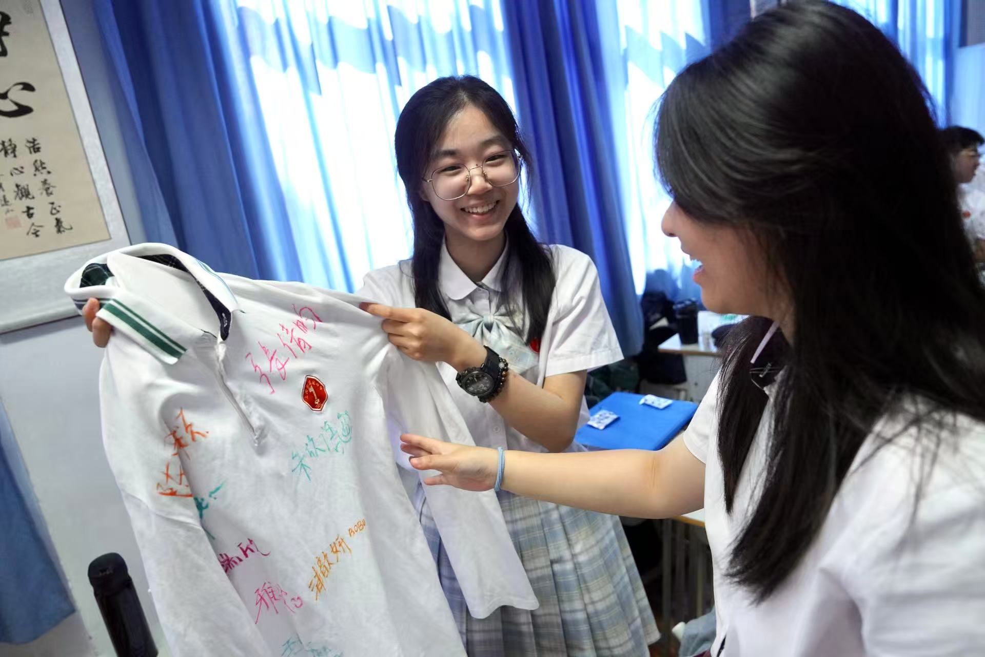 图为吴淞中学的同学们在校服上签上名字。劳动报记者 贡俊祺 摄影