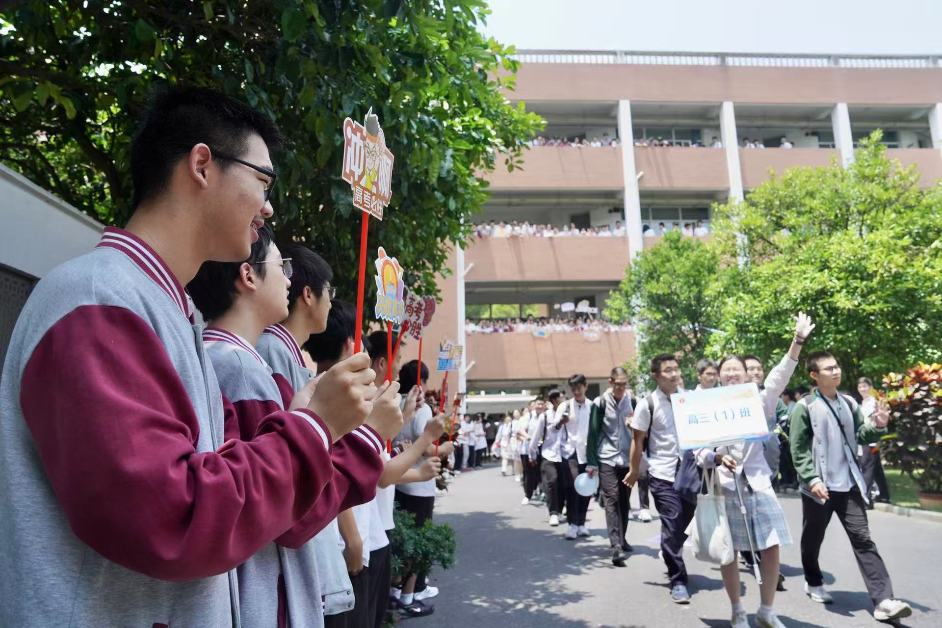 图为高三学子在老师和同学们的祝福中走出校园。劳动报记者 贡俊祺 摄影