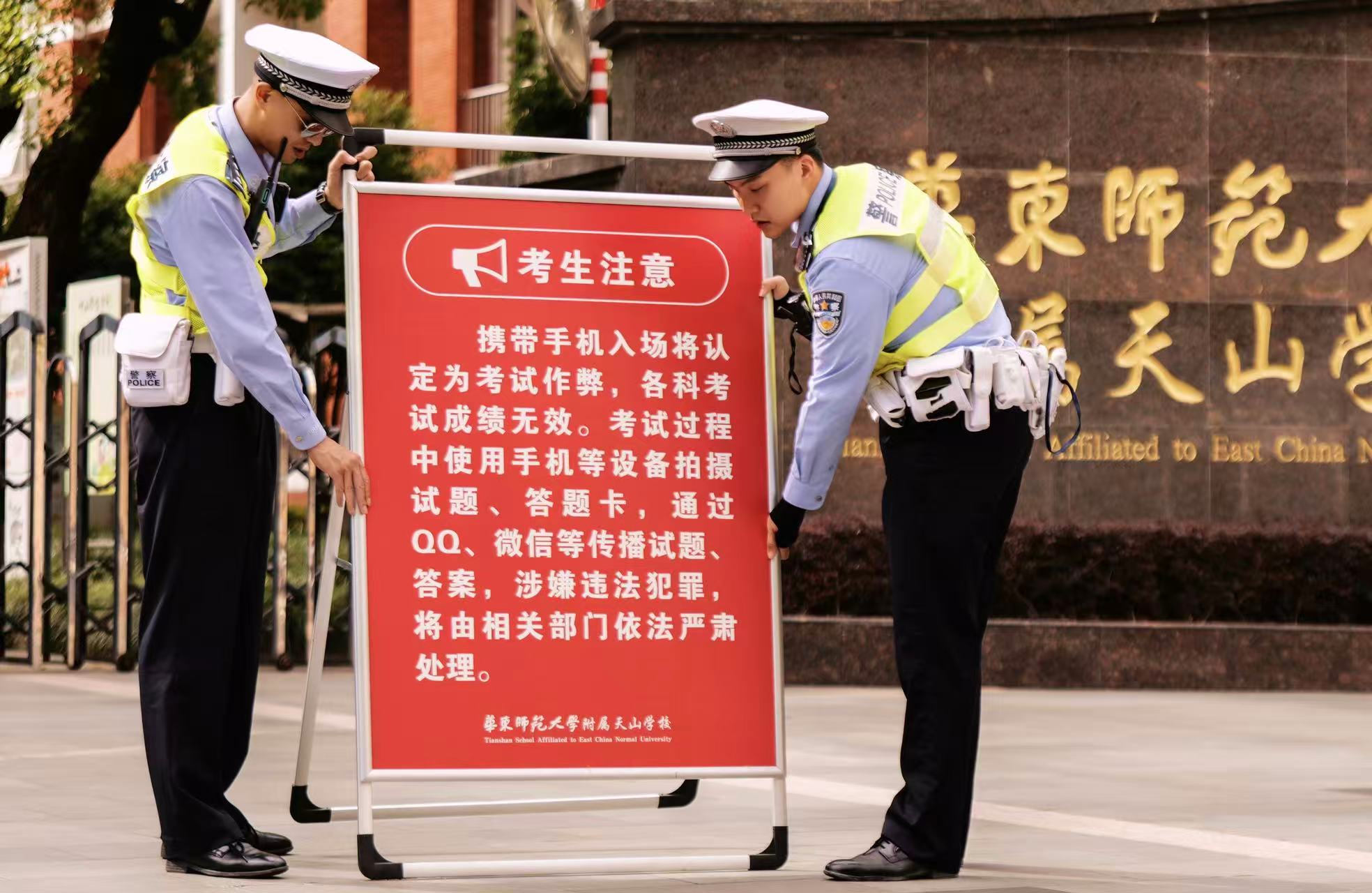 长宁交管支队的警察叔叔们就在这里守着,同学们安心答题!劳动报记者 贡俊祺 摄影