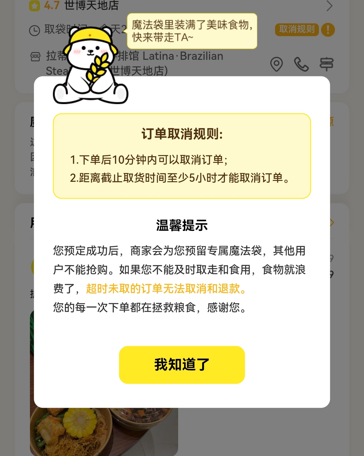 “不是20块钱的面包吃不起,而是15块钱3个更有性价比。”笔者在这款小程序内商铺的评论区看到不少消费者对“剩菜盲盒”这一模式感到支持,热门品牌的盲盒需要靠抢才能买到。但也有消费者反映盲盒内的食品不符合自己口味,或错过了取餐时间没有拿到订单。因而也提醒大家不要因为价格实惠冲动消费。根据平台规则,在消费者预定后,需要距离截止取货时间至少5小时才能取消订单,超时未取的订单无法取消和退款。