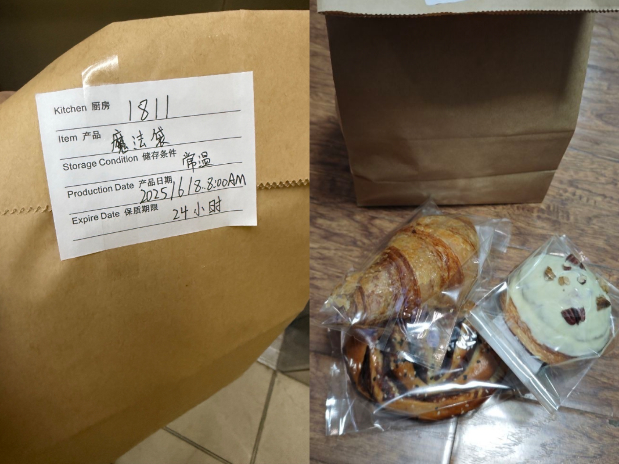 笔者在一款叫做“惜食魔法袋”的小程序看到,售卖“剩菜盲盒”的多为面包烘焙店铺。一份9.9元左右的盲袋中一般有2-3个面包,消费者下单后在规定的时间,通常在晚上8点以后至店铺打烊之前,可以到现场领取。除了面包,平台上也有售卖轻食简餐、卤味熟食、果蔬、饮品的商家。