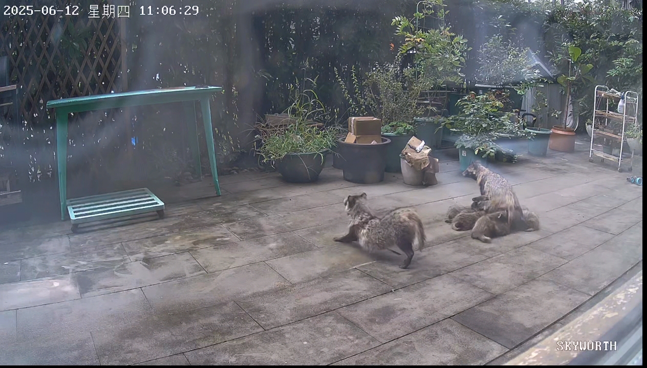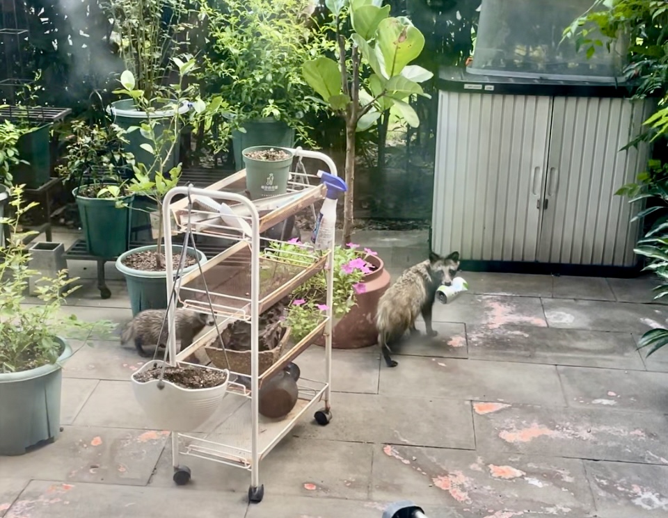 “前两年,偶尔会在小区看到一二只貉的踪迹,我们互不打扰。但今年5月上旬,2只大貉生了10只小貉,‘一大家子’把我们一楼居民的院子当成了游乐场和栖息地!”魏先生叹了口气说,“我们家就像它们的客厅,哺乳、玩耍、大貉对小貉的教学都在这里进行。”而这样的场景,白天晚上都会出现,有时候一天还会到访两三次。