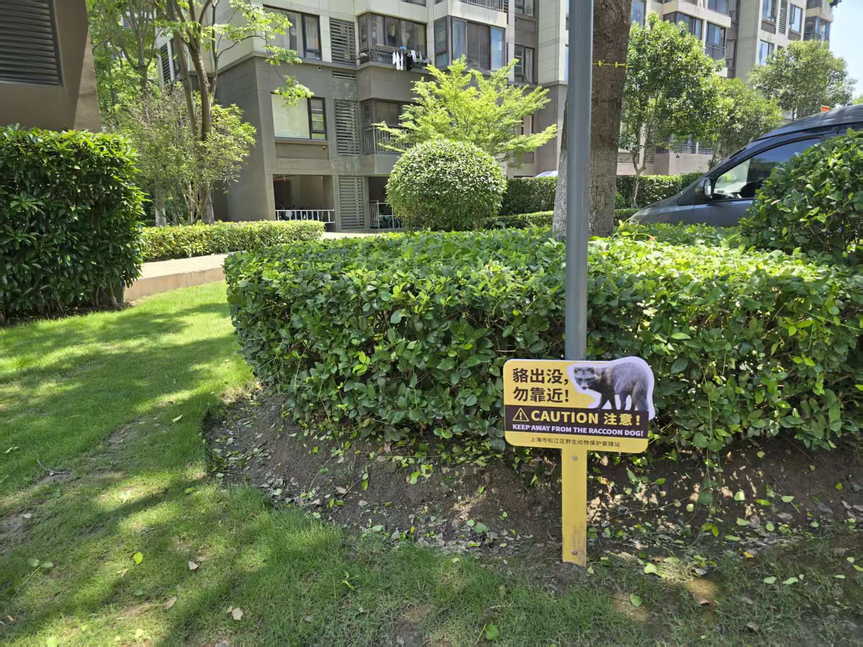 近日,记者来到松江区中山街道淡家浜88弄魏先生家。他家楼栋周边的绿化带内,摆放了多个写着“貉出没,勿靠近!”和“禁止投喂动物”的告示牌。