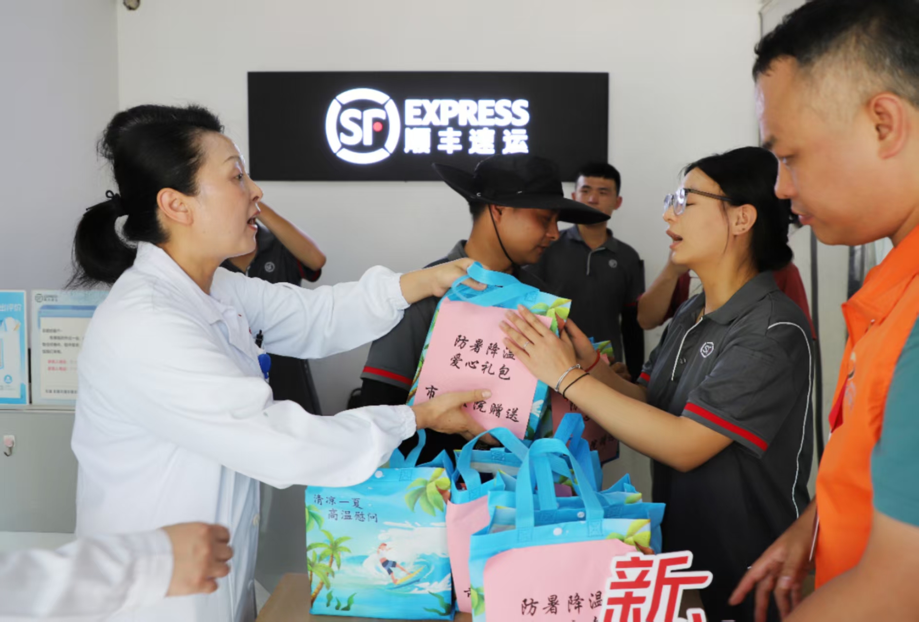 医务人员把防暑降温爱心礼包送达顺丰速递小哥手上。摄影 魏毅