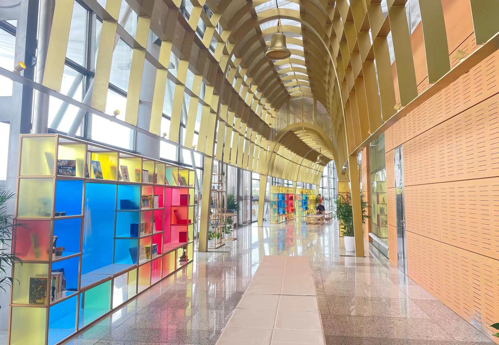 步入书房,绿植与多边形座椅延续车站的生态人文氛围,50米长的金色钢铁拱廊分成三段层层递高,既移植了中西融合的木质金字拱廊意象,又暗合从蒸汽时代到高铁时代的交通文明演进。柔和的阳光将整条长廊浸染成琥珀色,行走中仿佛漫步在凝固的、金色的时光里。