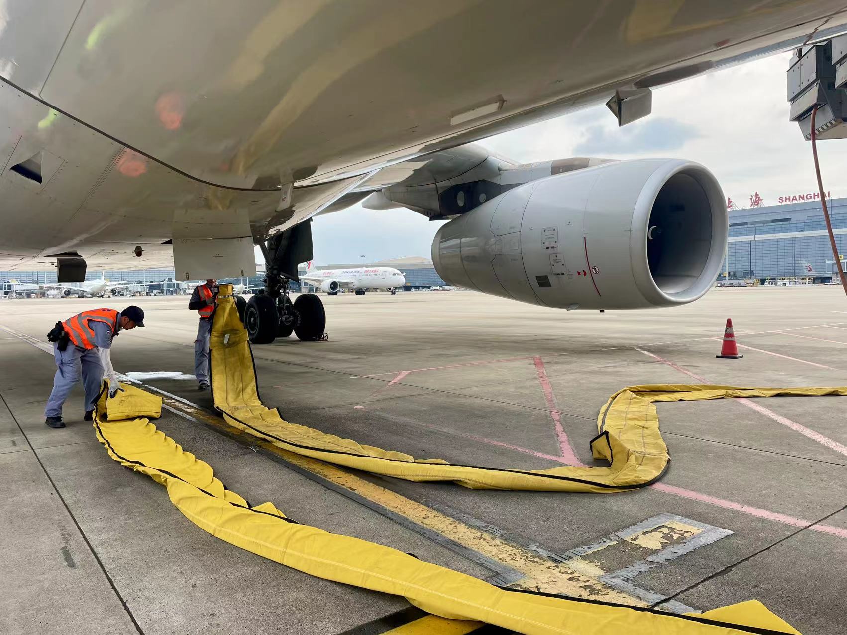 桥载设备操作员正在为降落的飞机安装空调管路。劳动报记者 包璐影 摄影