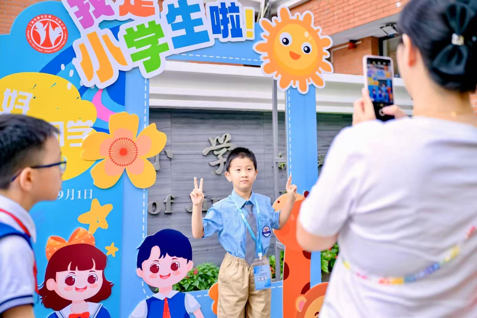 图为开学首日,家长为孩子拍照记录这一刻。劳动报记者 贡俊祺 摄影