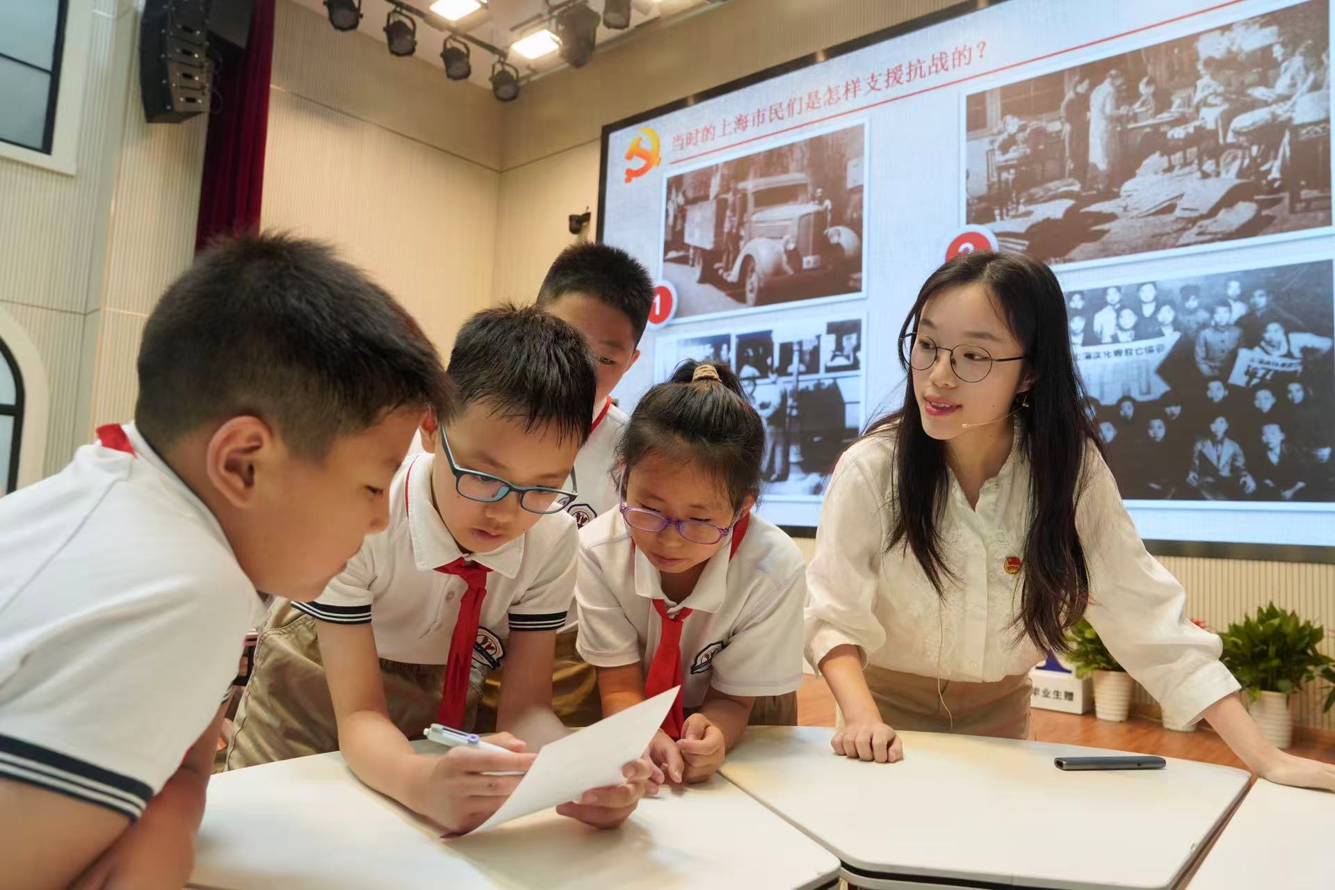 “上海市民如何支持抗战的?”开学第一课上,和老师一起小组讨论。劳动报记者 贡俊祺 摄影
