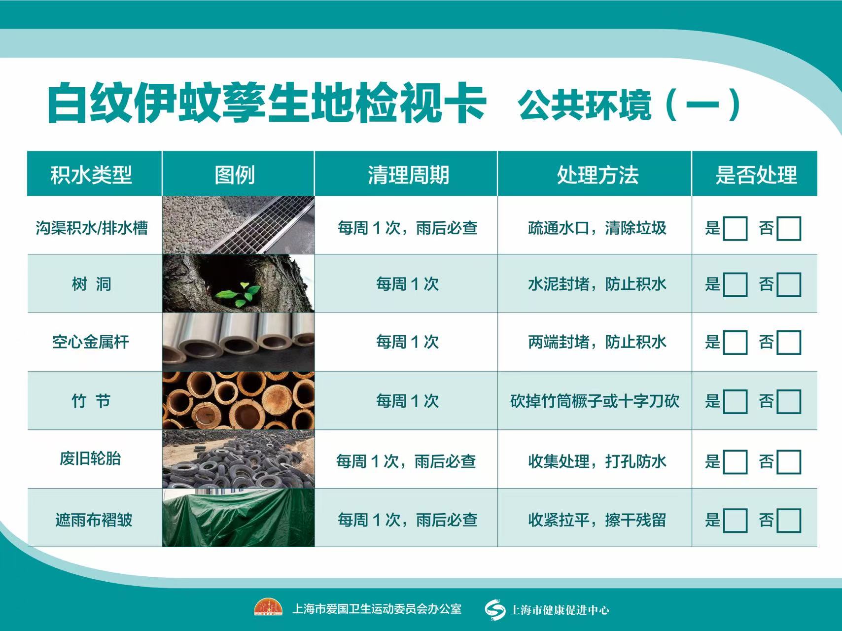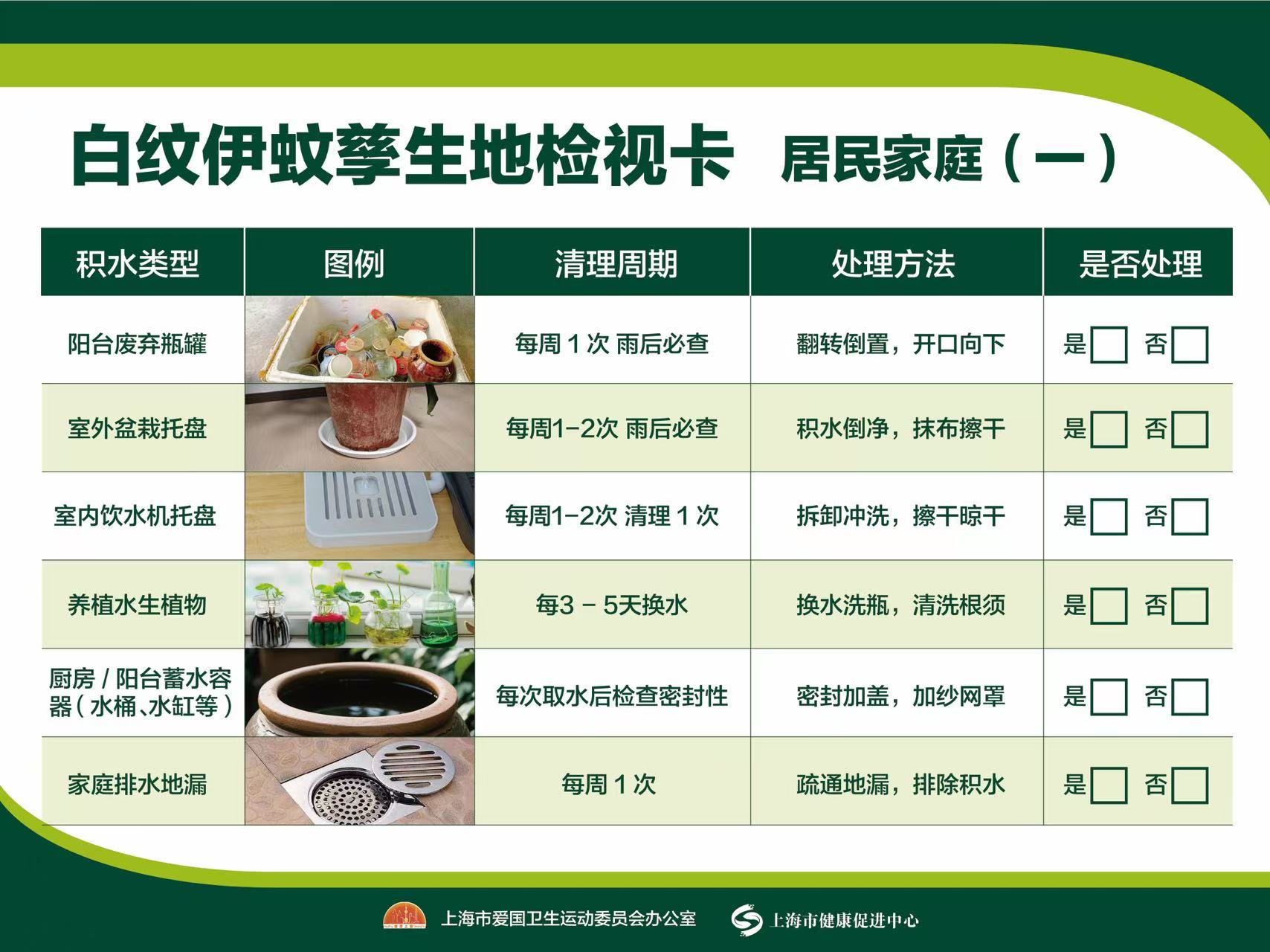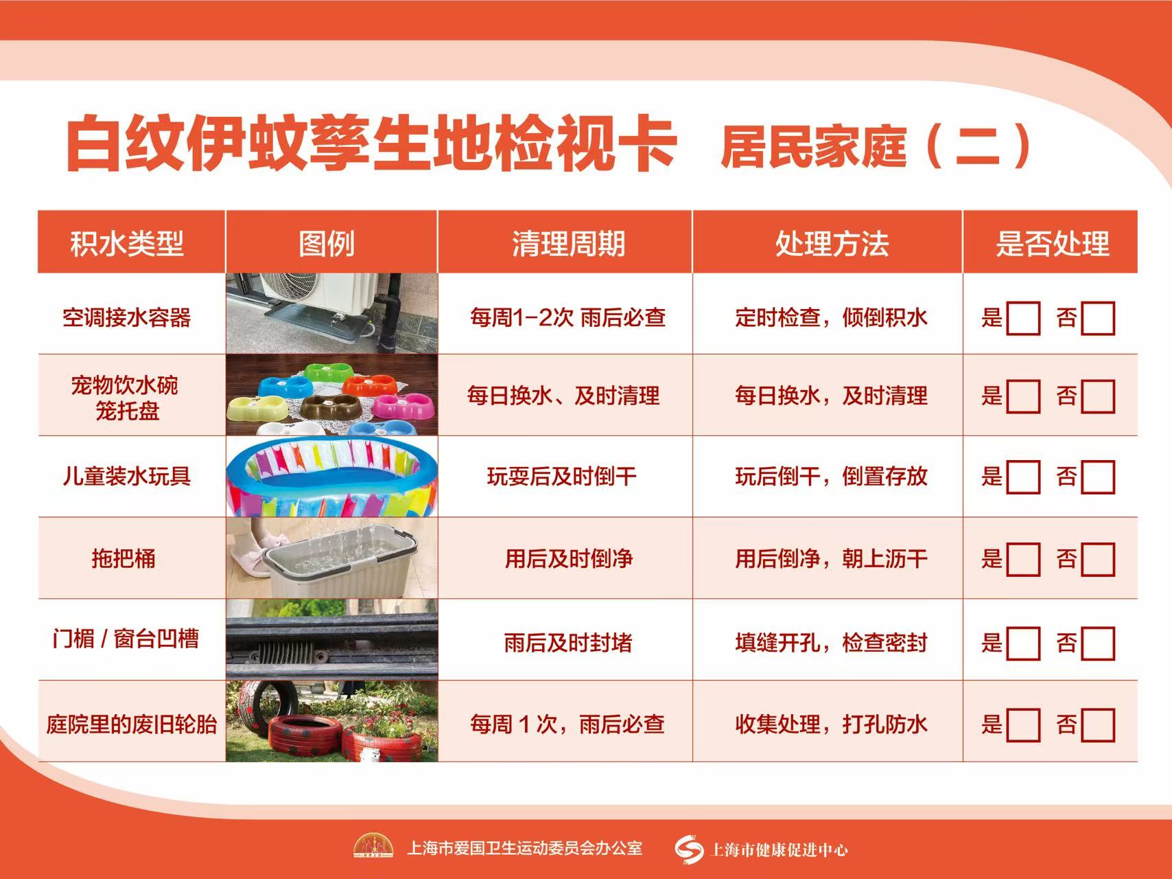 据气象部门预测,近期上海阵雨或雷阵雨天气较频繁,极易产生各种积水环境。对此,市爱卫办、市健康促进中心特别制作推出一套六张《白纹伊蚊孳生地检视卡》,涵盖居民家庭和各类社区、单位公共场所中常见白纹伊蚊孳生的积水类型及处置办法。