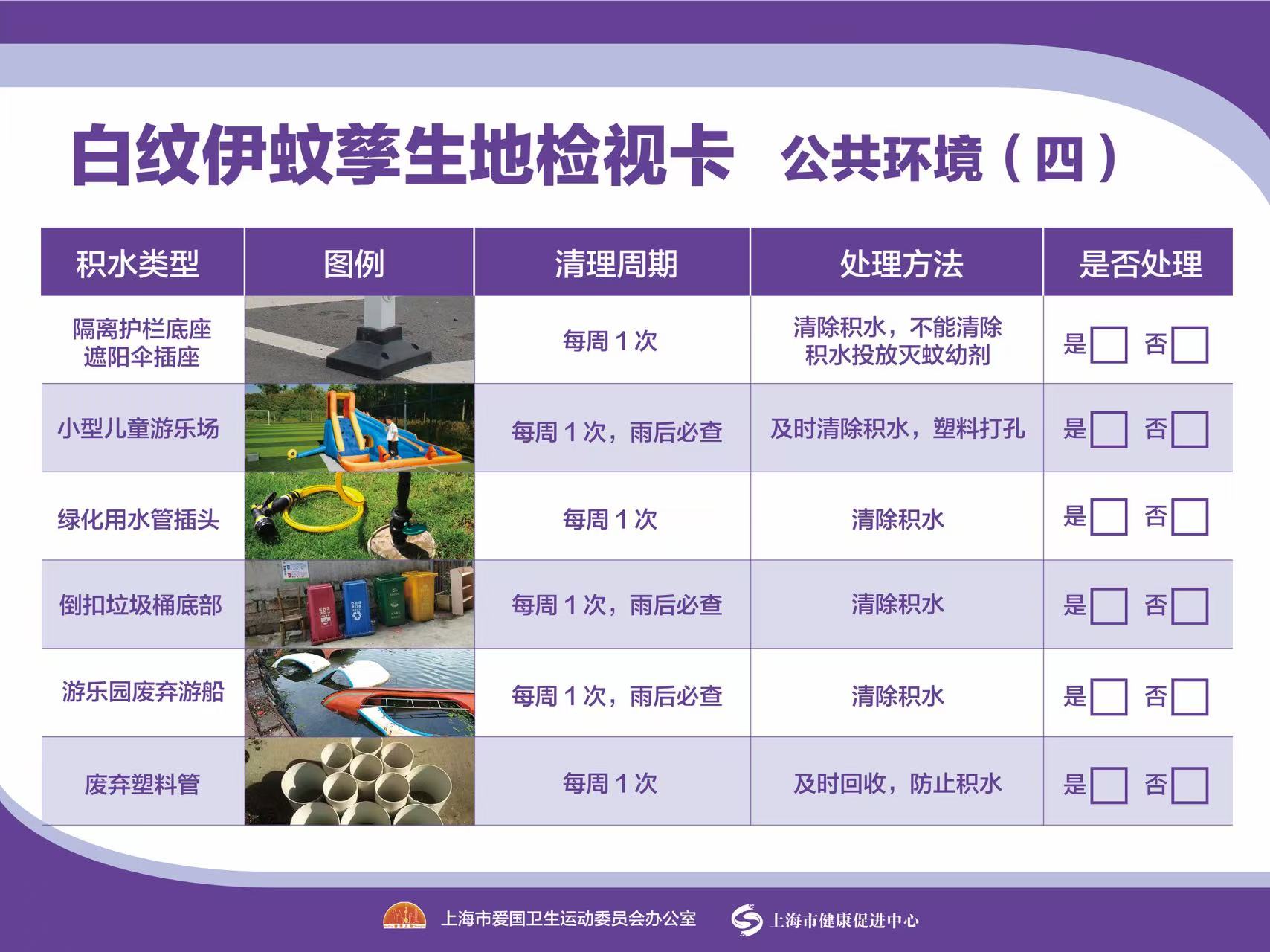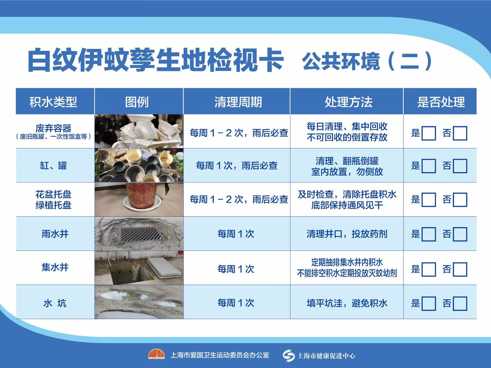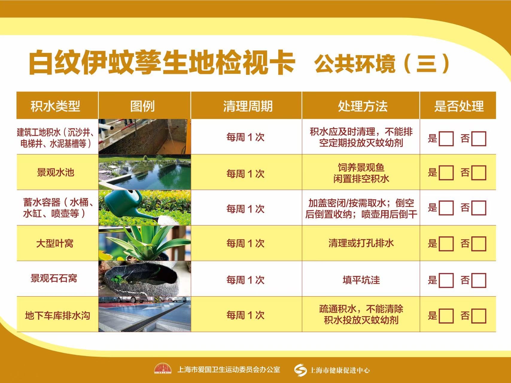 据气象部门预测,近期上海阵雨或雷阵雨天气较频繁,极易产生各种积水环境。对此,市爱卫办、市健康促进中心特别制作推出一套六张《白纹伊蚊孳生地检视卡》,涵盖居民家庭和各类社区、单位公共场所中常见白纹伊蚊孳生的积水类型及处置办法。