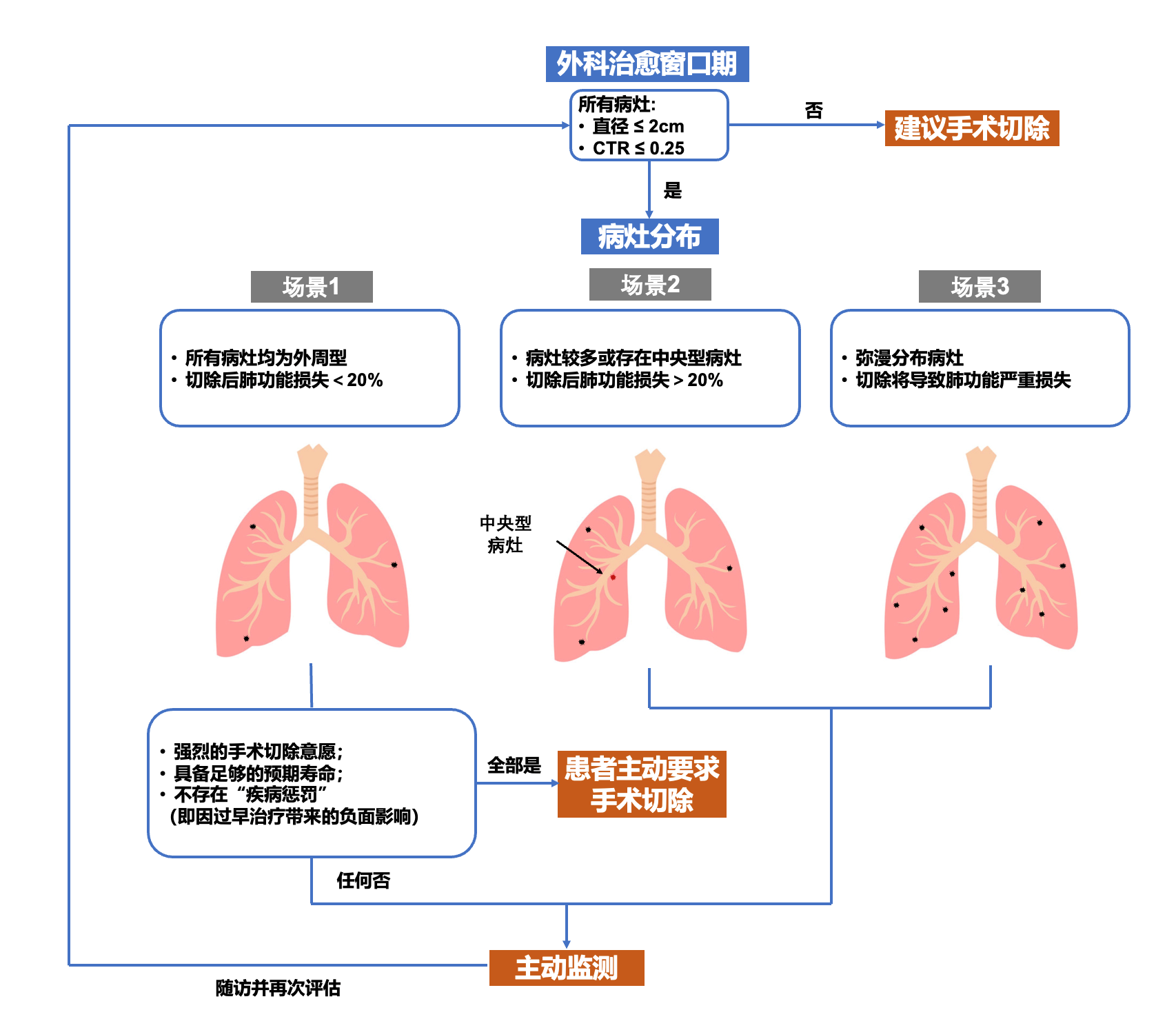 考虑到患者年龄、职业、婚育计划及病灶分布差异,陈海泉团队率先基于“肺功能损失评估”的三个不同场景,精准提出“复旦肿瘤”个体化管理策略(详见下图)。