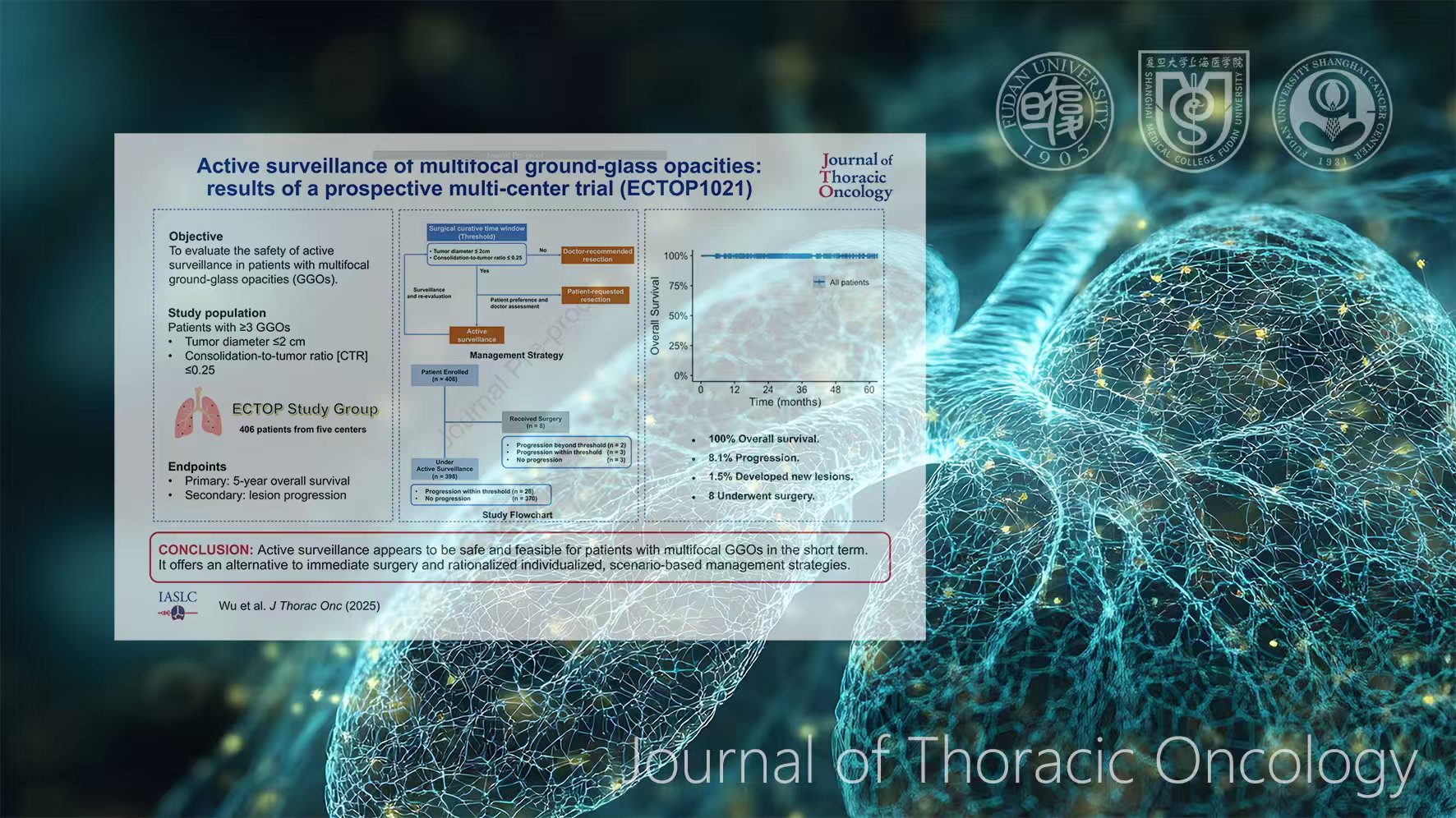近日,国际肺癌研究领域权威期刊《Journal of Thoracic Oncology》在线发表了一项由复旦大学附属肿瘤医院胸外科陈海泉教授牵头、国内多家医疗中心共同参与的前瞻性多中心临床研究成果。这项全球首个针对174名多发磨玻璃肺结节患者的主动随访研究,首次公布患者生存数据。研究首次证实:对于特定类型的肺多发性GGO患者,在“外科治愈窗口期”内实施主动监测策略安全可靠,提出了“多发GGO的选择性根治术”,为即刻手术之外的个体化治疗提供了循证依据。