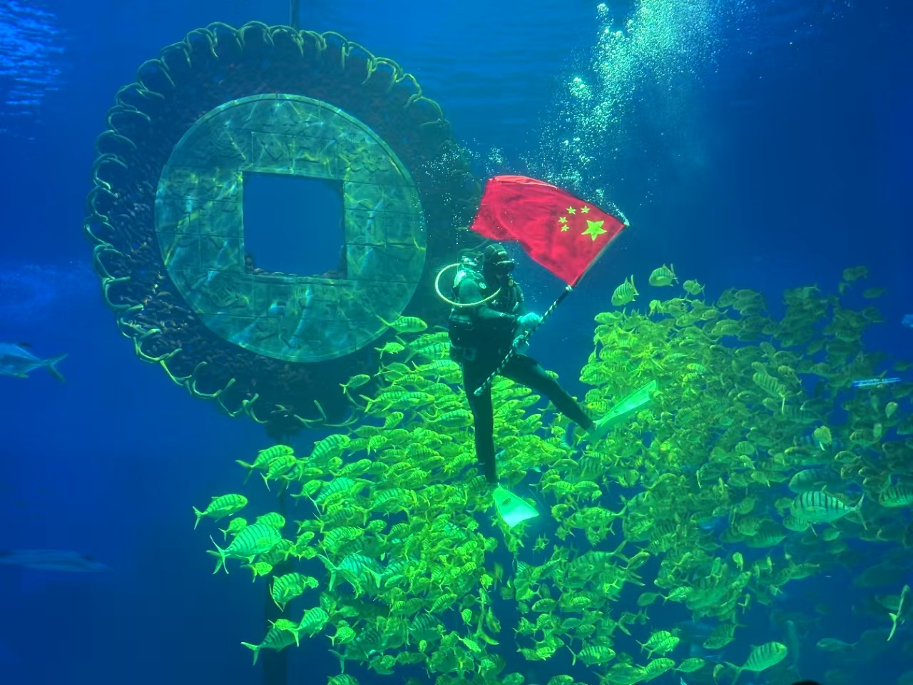 海南陵水富力欢乐海洋世界美人鱼表演现场,一名潜水员在水下挥舞五星红旗,祝福祖国繁荣昌盛。劳动报记者陆燕婷 摄影