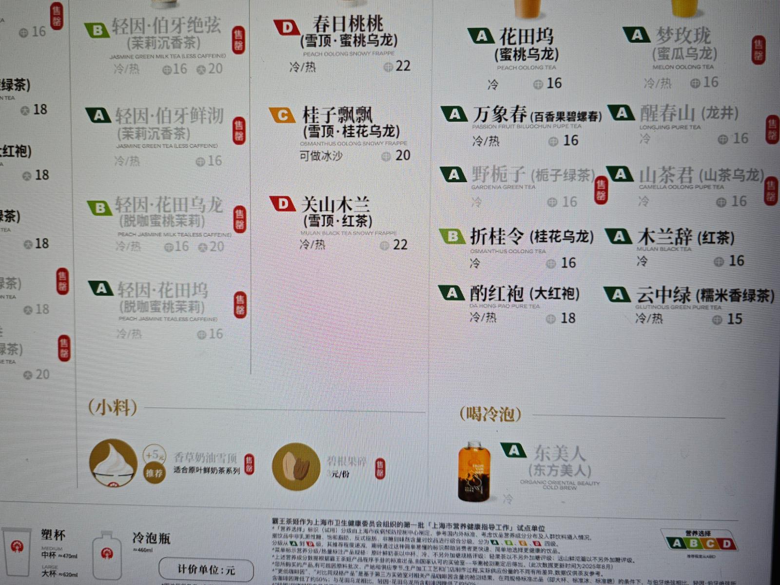 奶茶店菜单上的“营养选择”分级标识。劳动报记者于玘珺 摄影